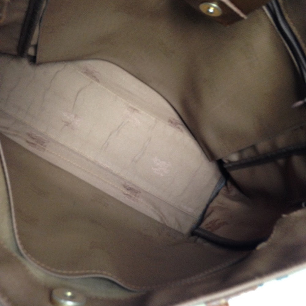 This is a beautiful, pre-owned Tote or shoulder bag made of plaid coated canvas with brown leather handle and trim. It measures 13 inches long, 11 inches high and 4 inches wide. It has wear on Leather handle or straps, soiling and discoloration, some fraying and scuffs covered with floral and butterfly appliqués as shown in photos. Dry cleaning recommended. Please super size photos for condition details.