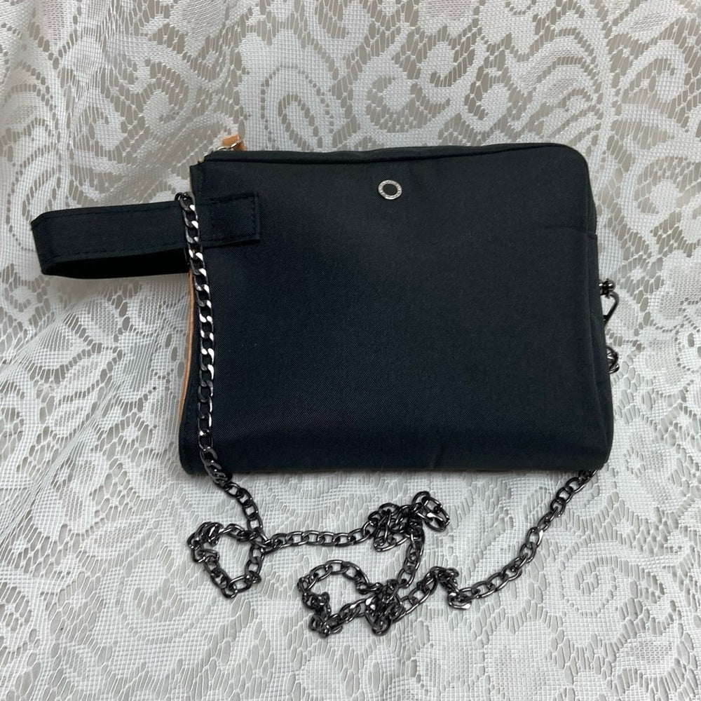 This is a beautiful, travel pouch made of black canvas and tan leather trim. It measures 8 inches long, 6.5 inches high and 2 inches wide. It comes with wristlet strap and an added 48-inch black chain to make it as a crossbody. It is in very good condition as shown in photos. Please supersize photos for condition details.