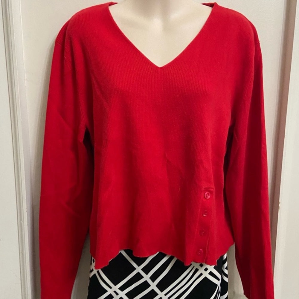 This is a beautiful, pre-owned, red sweater. It is in very good condition as shown in photos. The actual measurements follows: