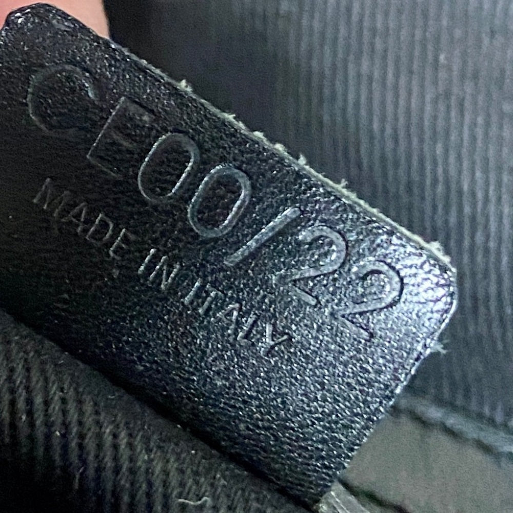 This is a pre-owned nylon handbag with black leather trim and handle. It measures 12 inches high, 10 inches long and 4 inches wide and comes with a 20-inch drop handle or shoulder leather strap. It is in good condition with minimal wear as shown in photos. It is marked : Celine, Made in Italy with code as CE00/22.