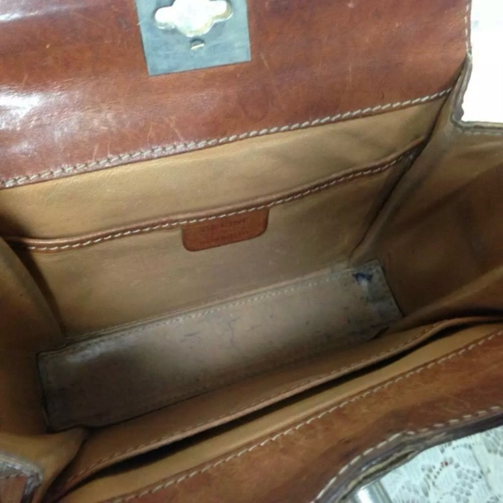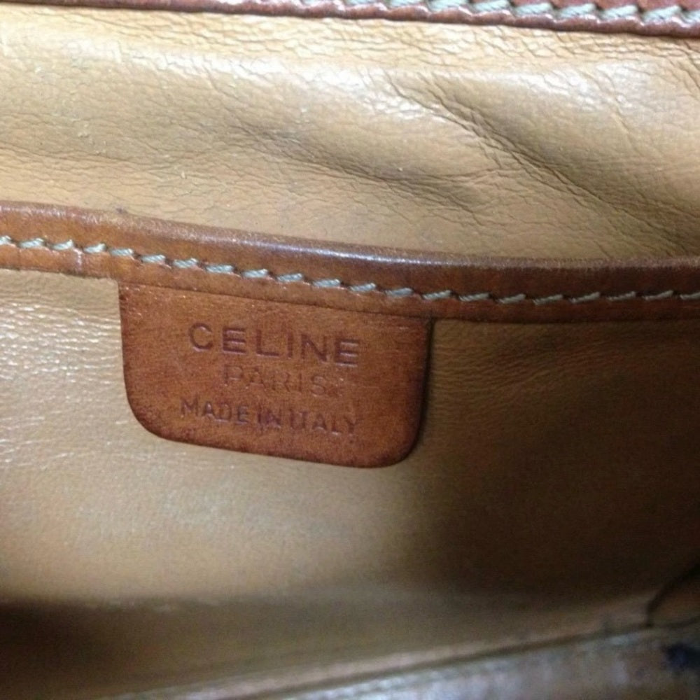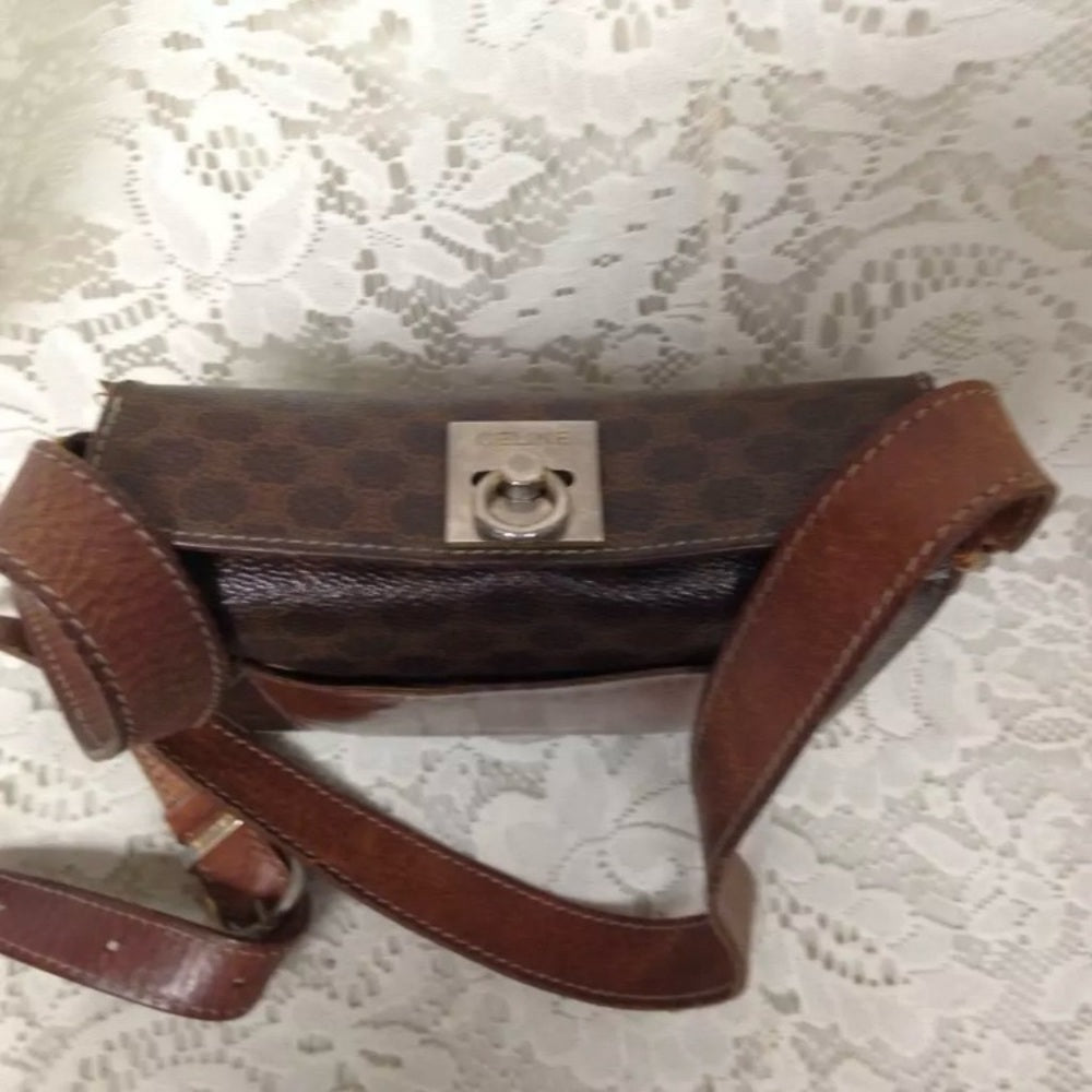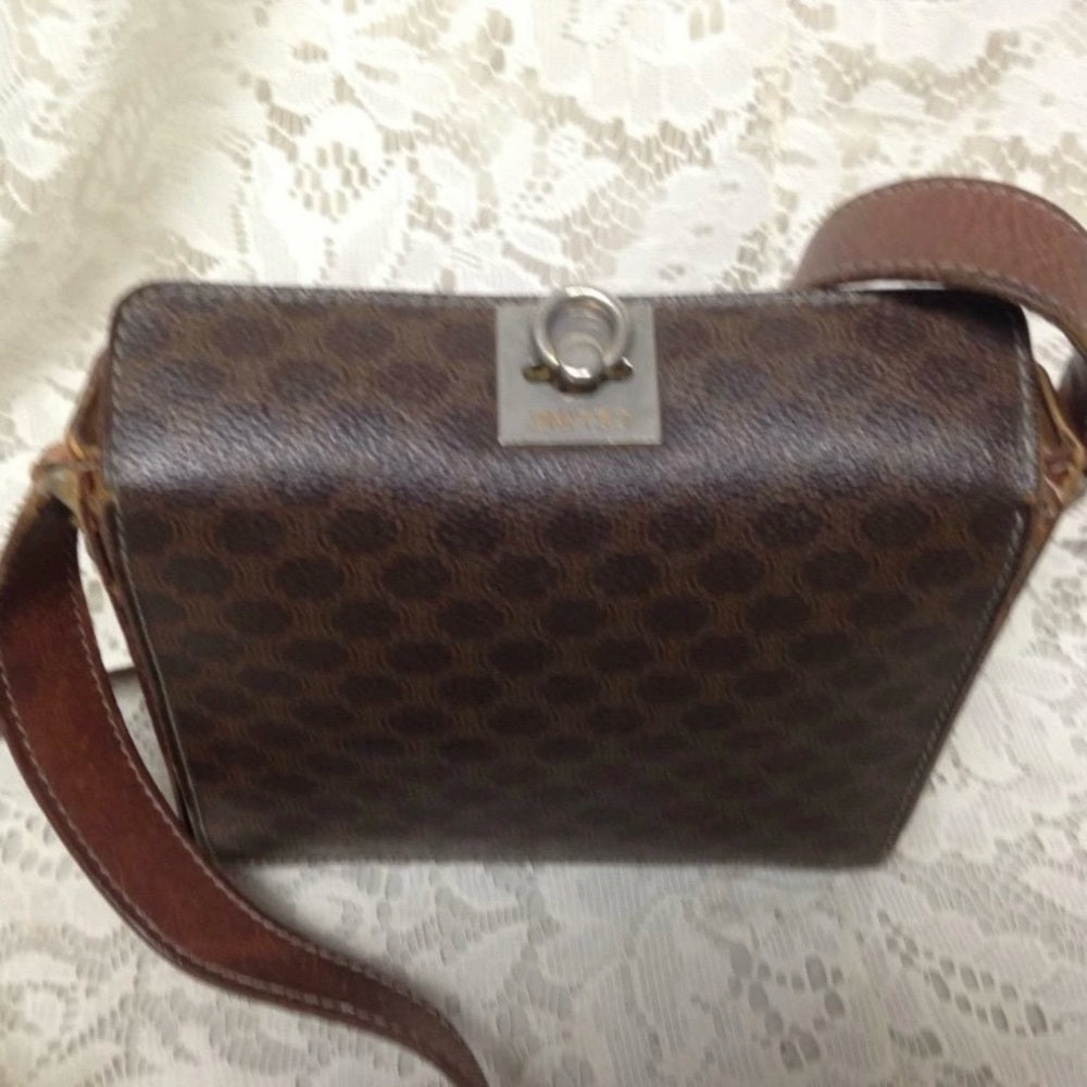 This is a pre-owned boxy, square small handbag made of brown macadam coated canvas. It measures 6.5 inches long, 5.5 inches high, 2 inches wide and comes with a 42 inch adjustable crossbody strap. It has metal wear, leather trim discoloration and soiling but overall it is in good condition as shown in the photos. Makers tag is Celine, Paris, Made in Italy. Code: M91Package weight is about 2 lbs.