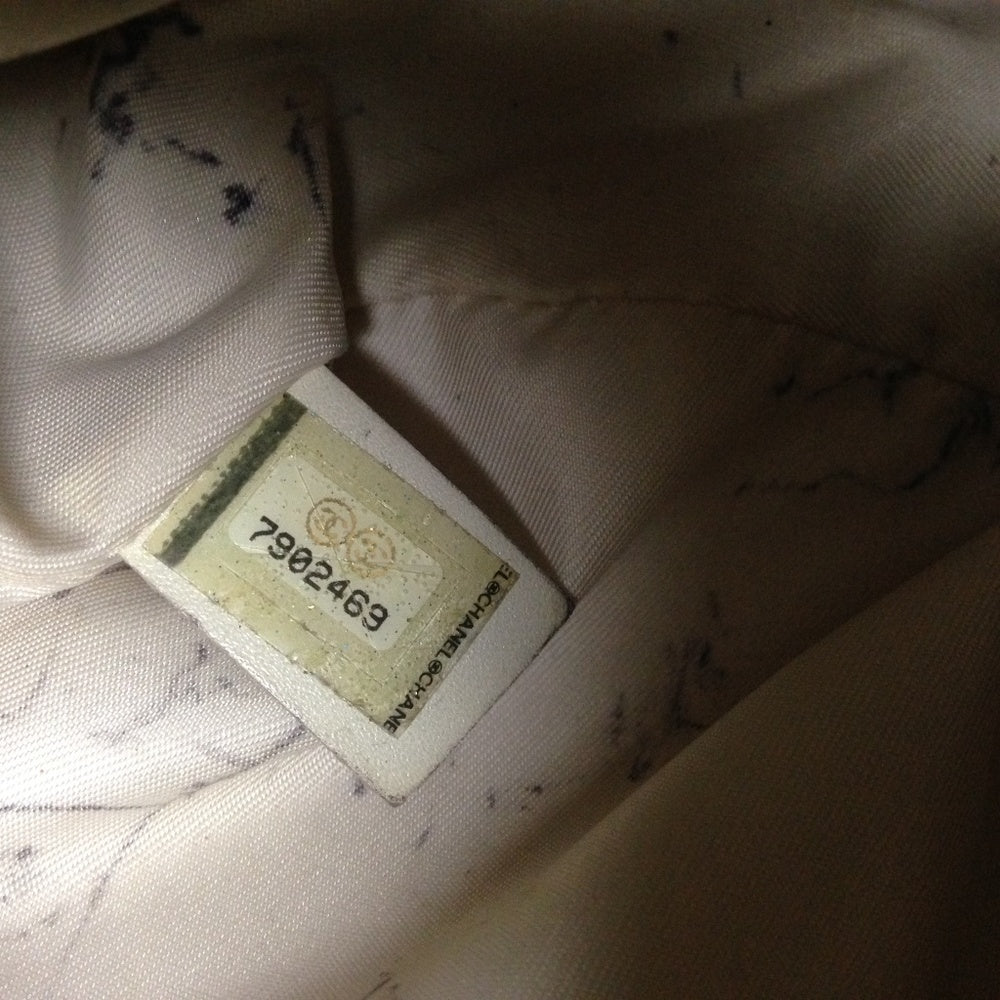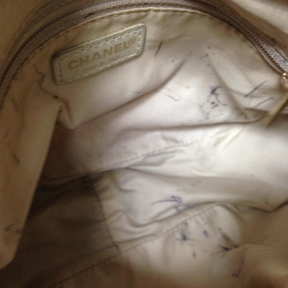 This is a beautiful , large weekend or beach bag made of khaki colored metallic silver fabric. It measures 9inches long, 6 inches high and 3 inches wide and comes with a 15-inch handle. It has soiling, ink stain on lining, wear on leather straps, repair on handle and scuffs on bottom corners as shown in photos. Dry cleaning recommended. Serial No. 7902463. Super size for details.