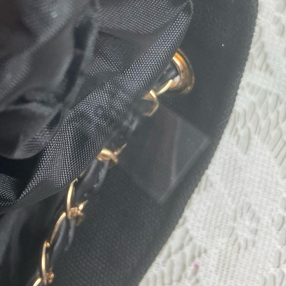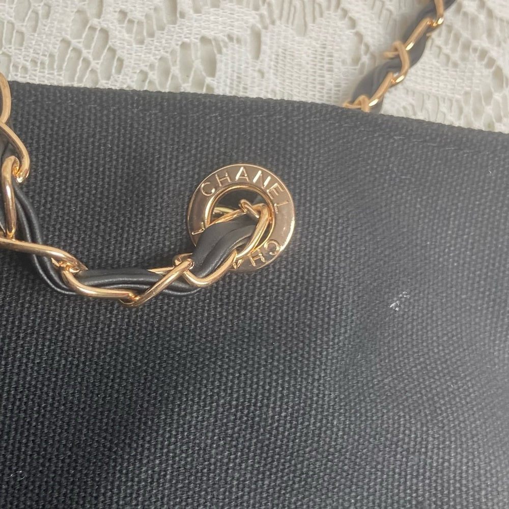 This is a beautiful black Shoulder bag or tote made of black denim or canvas. It measures 15 inches long, 13 inches high and 4 inches wide and comes with a 32-inch shoulder strap. It is in very good condition as shown in photos. This novelty tote has a transparent Chanel tag and Chanel engravings on 4 strap metal rings as well. Please supersize photos for condition details.