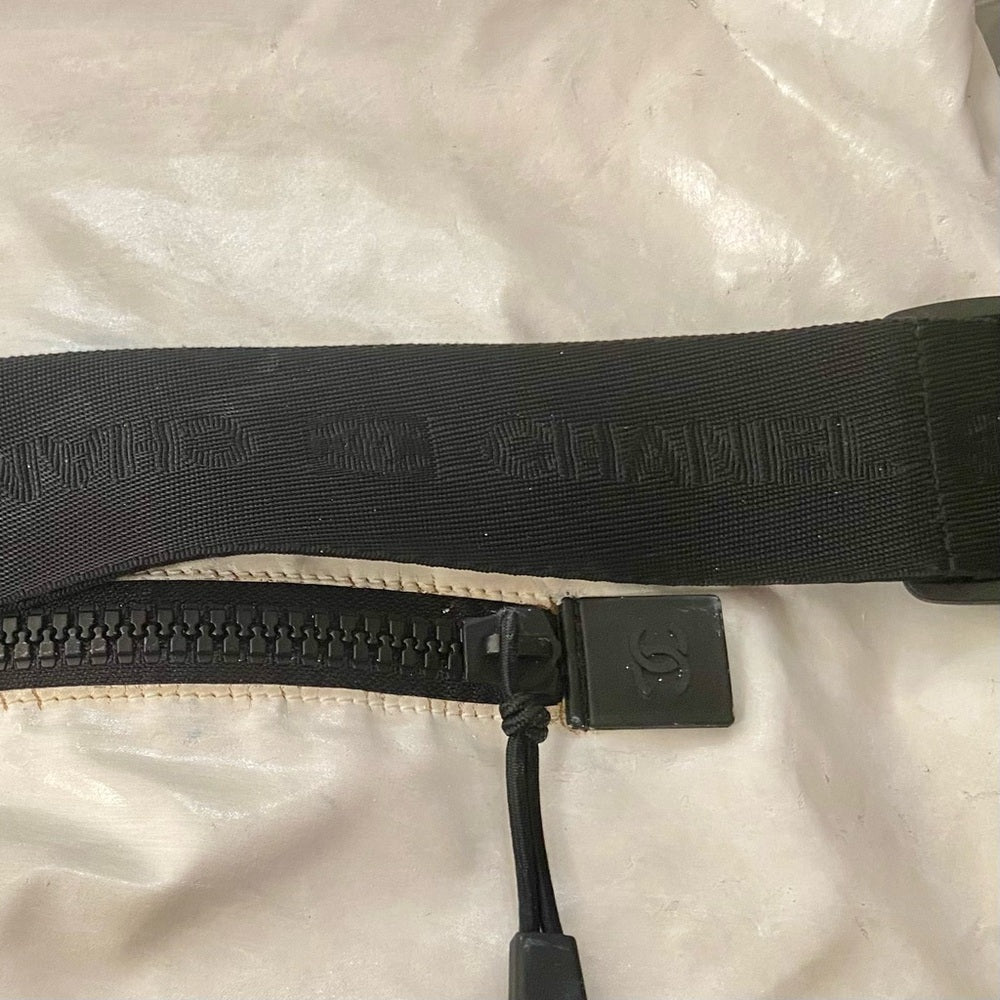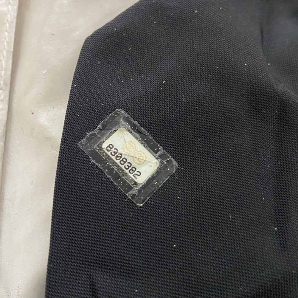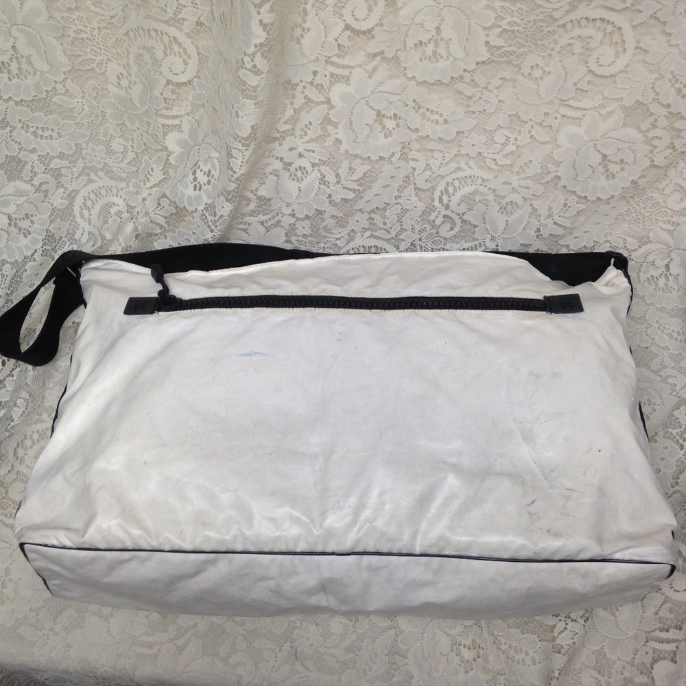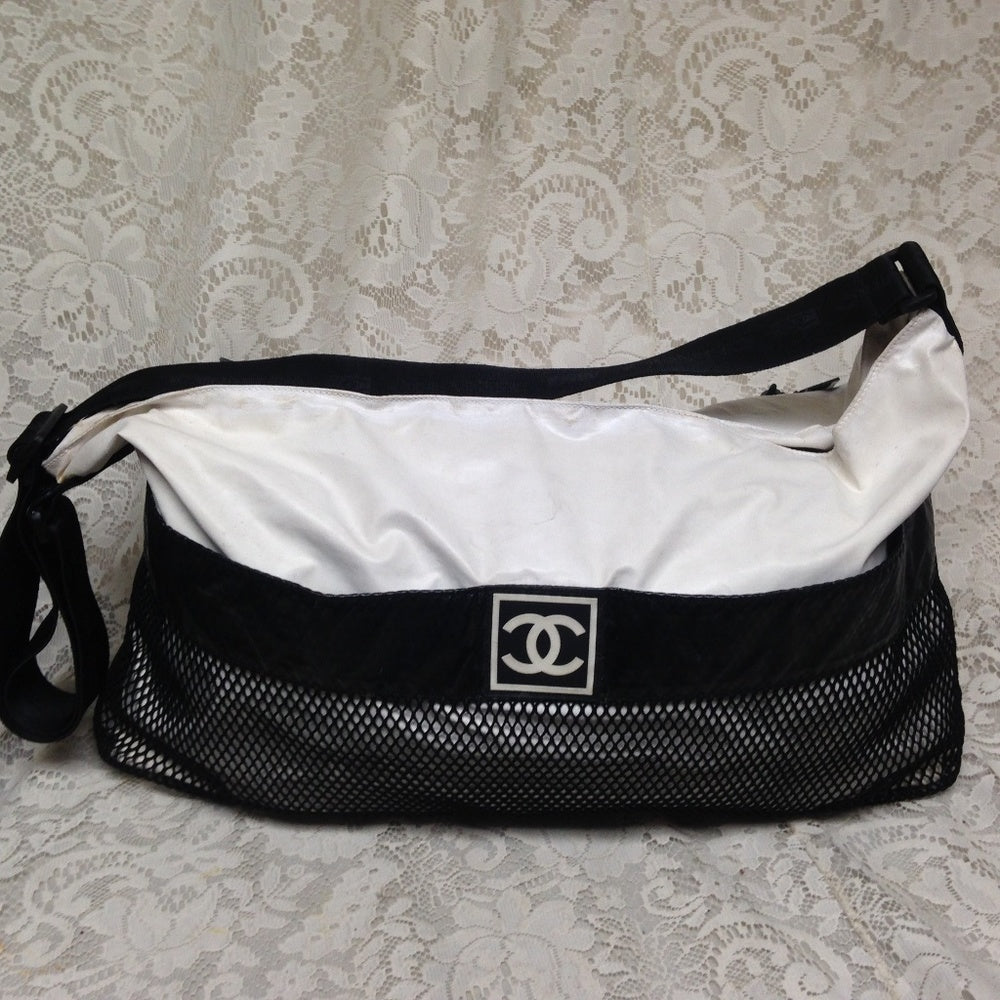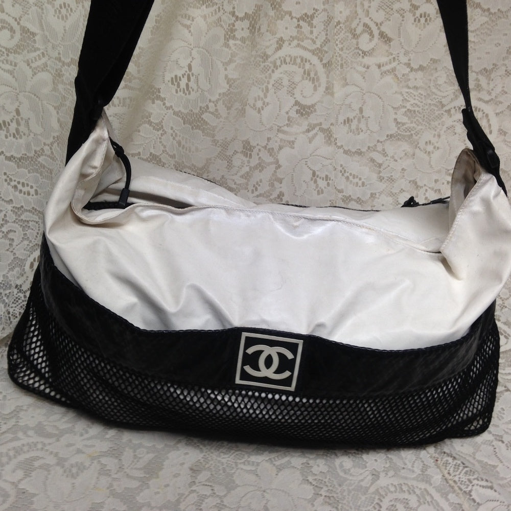 This is a beautiful , large weekender or beach bag made of white and black nylon material. It measures 20 inches long, 10 inches high and 8 inches wide and comes with a 44-inch adjustable strap. It has soiling, discoloration, spots, scuffs, etc but overall it is in good condition as shown in photos. It is marked Chanel with Serial No. 8308382.