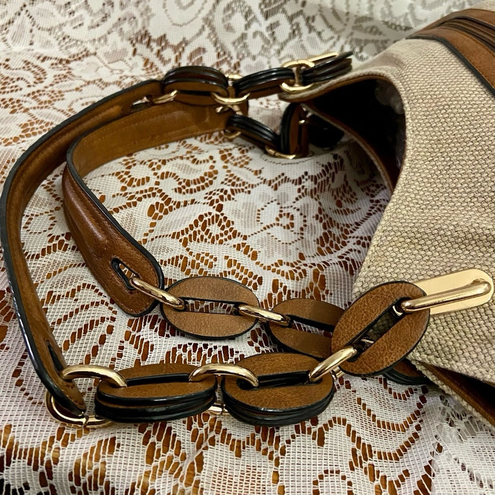 Clark’s Beige Linen-Canvas with Brown Leather Trim and Strap Shoulder Bag
