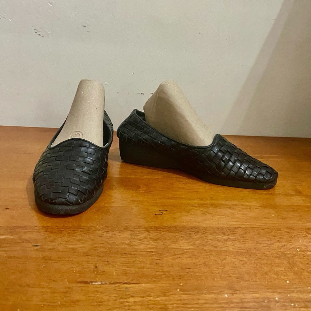 T his is a beautiful pair of shoes or loafers made of black woven leather. or It is Size 8B and it measures 10 inches long, 3.25 inches wide, and 3.5 inches high with 1.5 inch platform. heel. It is in good condition as shown in photos.