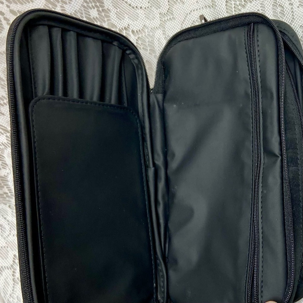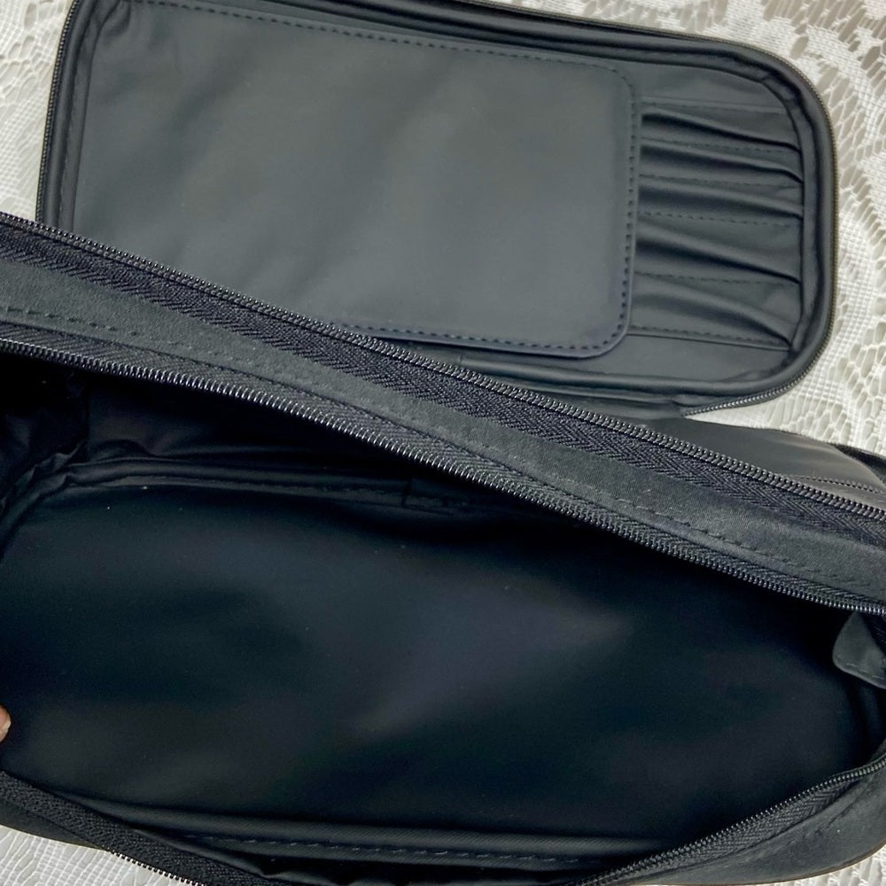 This is a beautiful, travel or cosmetic pouch given as gifts to VIP customers with large purchase. It is made of black canvas-nylon and it measures 9 inches long, 4.5 inches high and 2 inches wide. It comes with an added 48-inch black chain to make it as a crossbody. It is in very good condition as shown in photos. Please supersize photos for condition details.