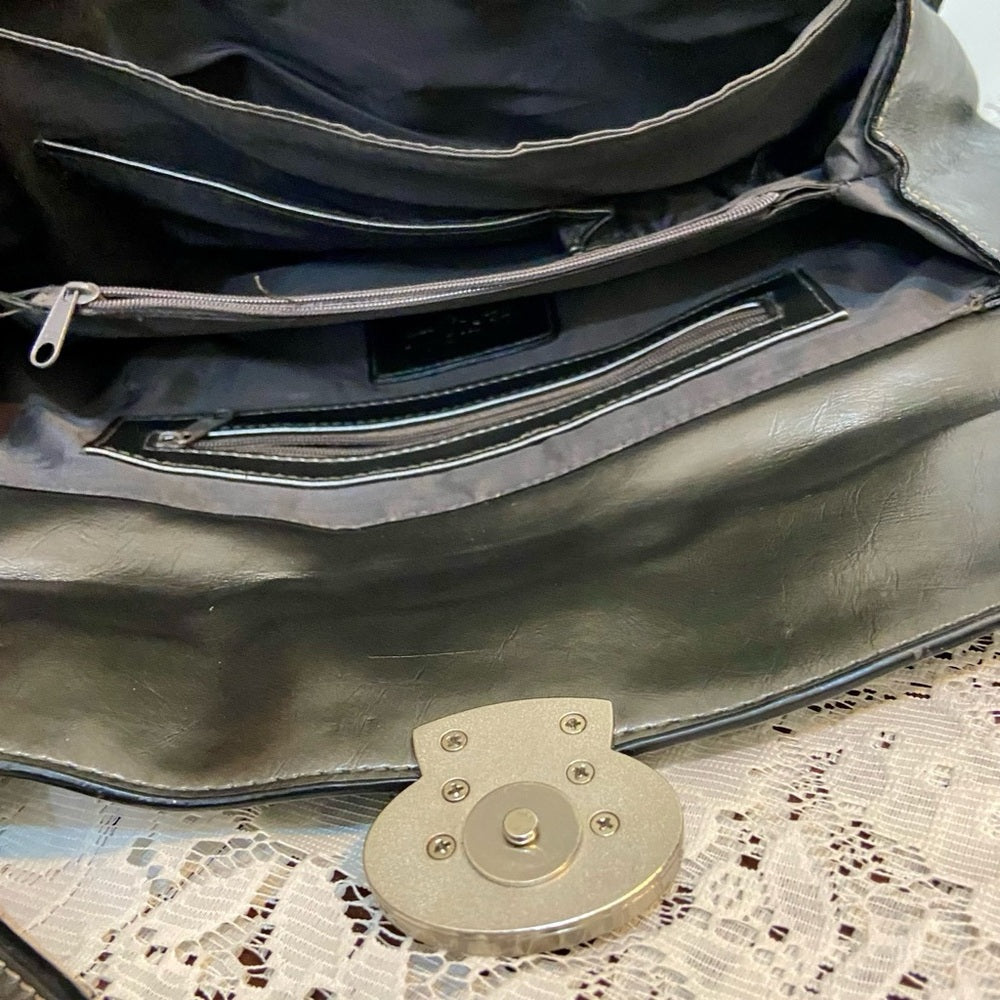 This is a beautiful handbag made of metallic silver faux leather and comes with a 27-inch handle or shoulder strap. It measures 12.5 inches long, 7.5 inches high and 2.5 inches wide. It has 3 compartments and 2 zip pockets. It is in good condition as shown in photos. Pictures are worth a thousand words so please super size photos for condition details.