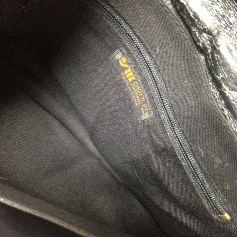 This is an elegant Clutch made of Black Snakeskin leather. It measures about 11 inches long, 7inches wide and 2 inches deep. It is in good condition with minimal wear on the exterior and inner lining shows repair on the flap fold area as shown in photos. It has a makers label as Magnum Fashion Inc. This is a used item and it is being sold as is and as described.