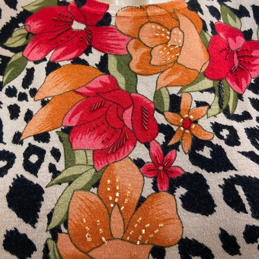 This is a gorgeous cheetah print sleeveless top with floral beaded embellishments. It is in good condition with minimal wear as shown in photos.