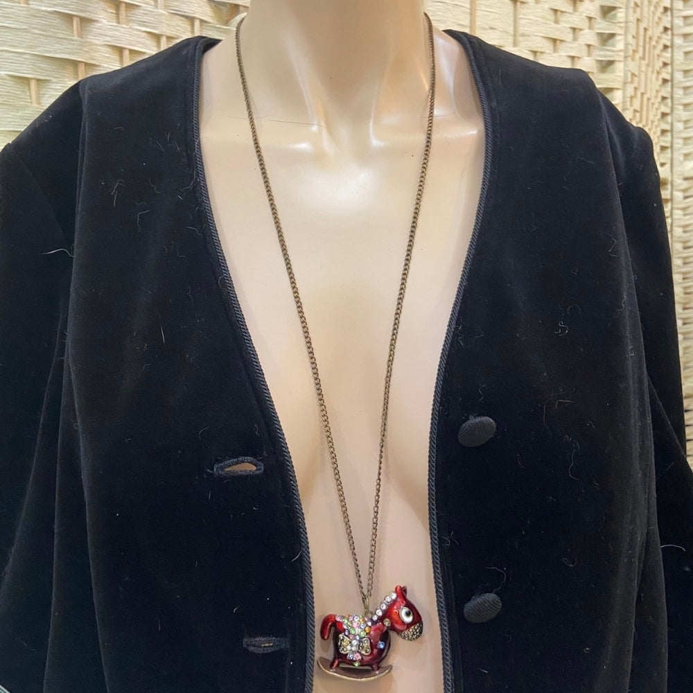 This is a beautiful necklace with an enamal rocking horse pendant in the color red decorated with multi colored rhinestones. It is in good condition with minimal wear as shown in photos. The pendant measures 2" long and 2" wide. The brass chain measures 32" long. Please super size photos for condition details.