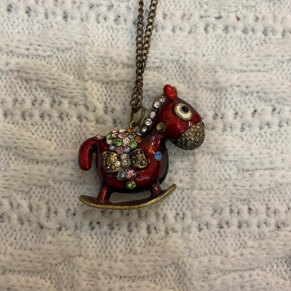 Enamal Red Rocking Horse with Rhinestones and Brass Chain