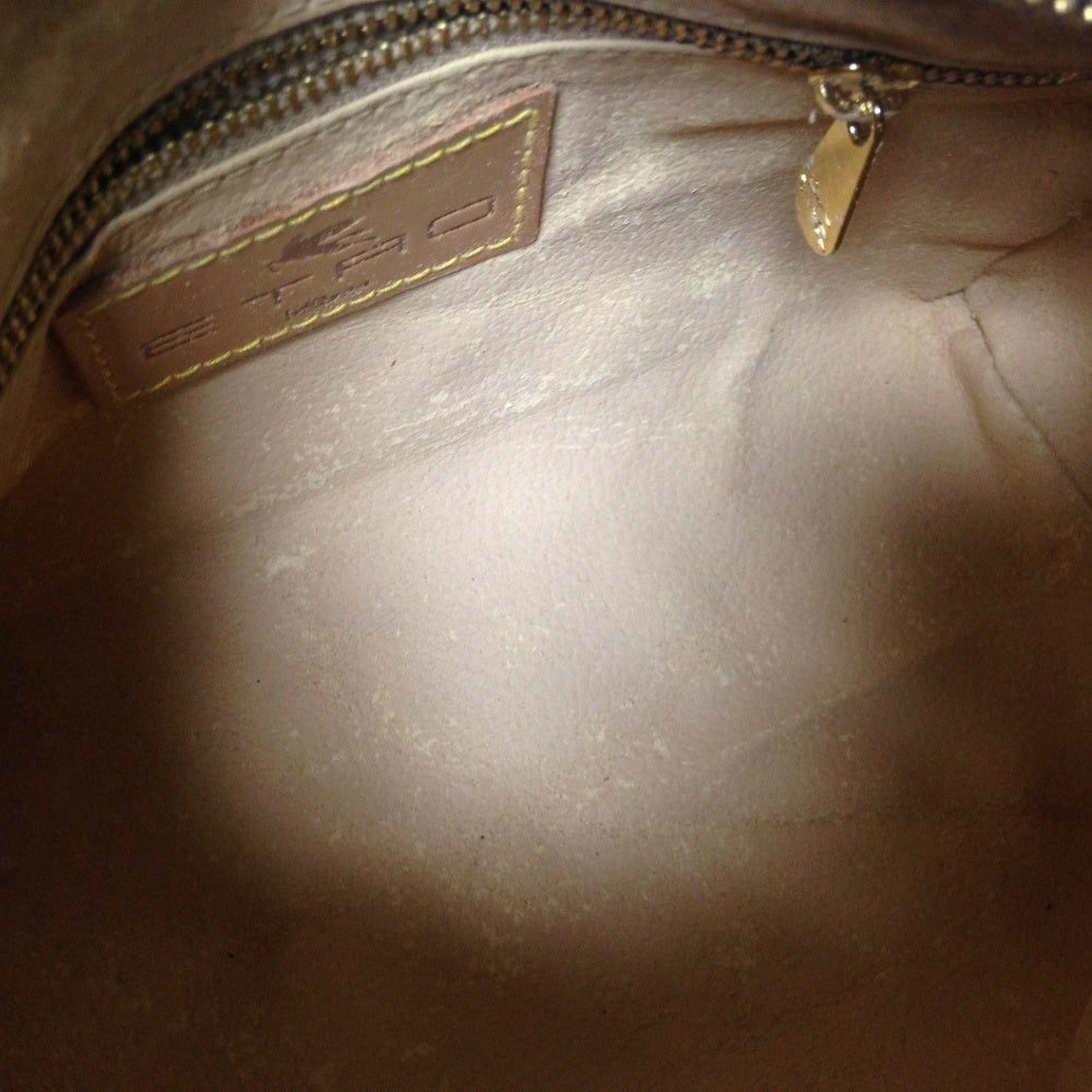 This is a pre-owned, small Speedy Style handbag made of burgundy paisely coated canvas. It measures 8 inches long, 4.5 inches high, 4 inches wide. It is in good condition with lining issue, rough but not sticky as shown in the photos. Makers tag is Etro Made in Italy. N 0701848 12 Sept 95 0404 Etro, Made in Italy.