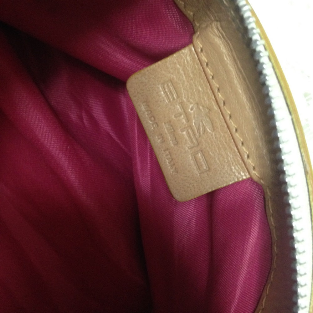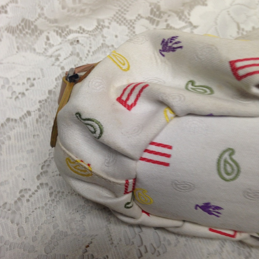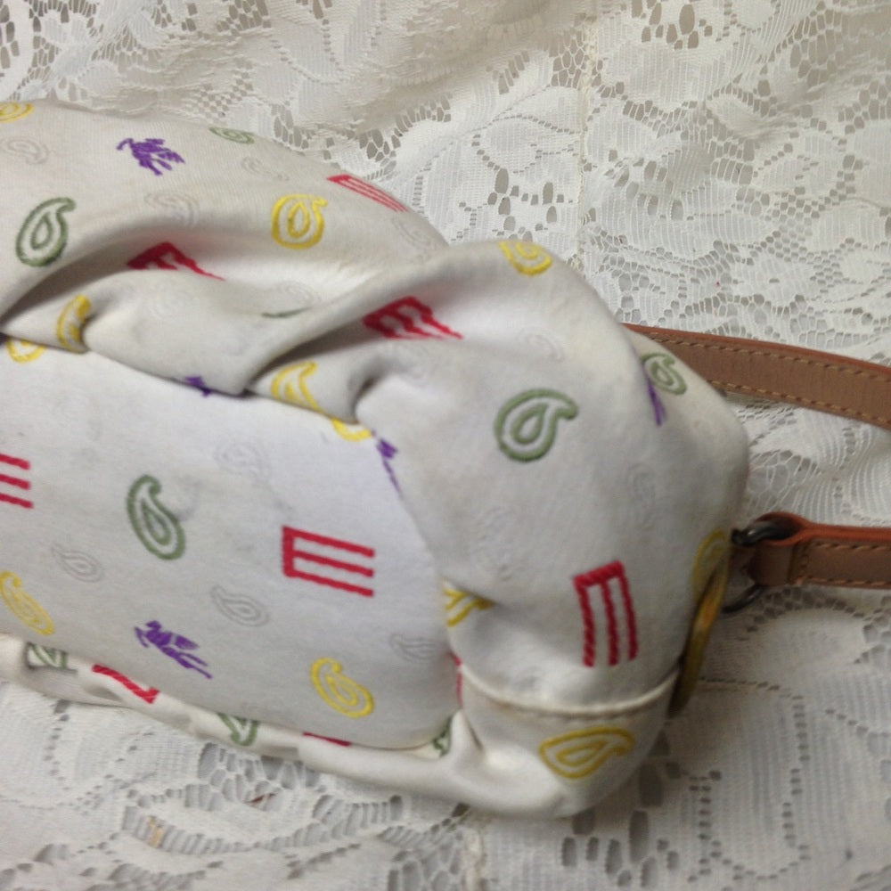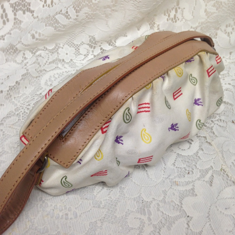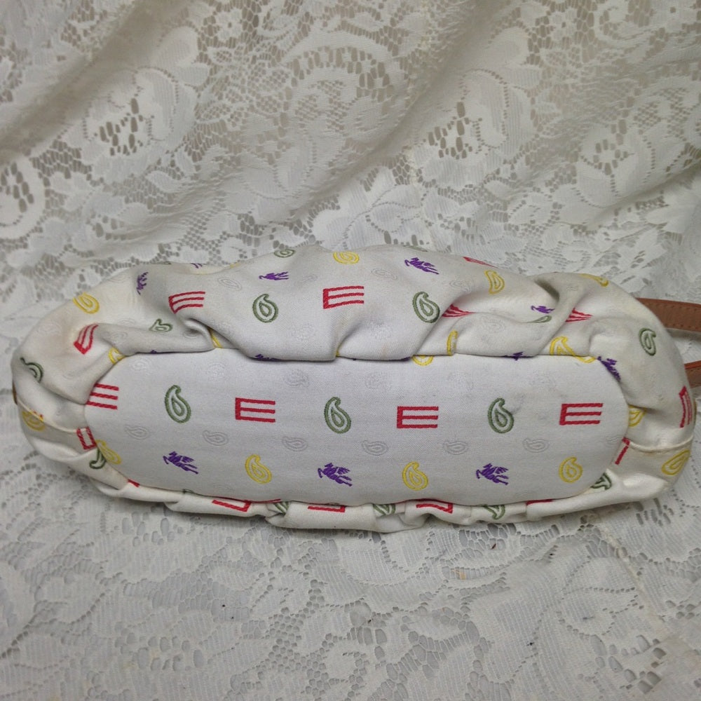 This is a beautiful, multi-color monogram over a white canvas with tan brown leather trim. It measures 8 inches long, 6 inches high and 3 inches wide and comes with a 6 inch drop handle. It has soiling, spots and wear as shown in the photos. Dry cleaning recommended.It is marked : Etro Made in Italy with code as shown in photo.