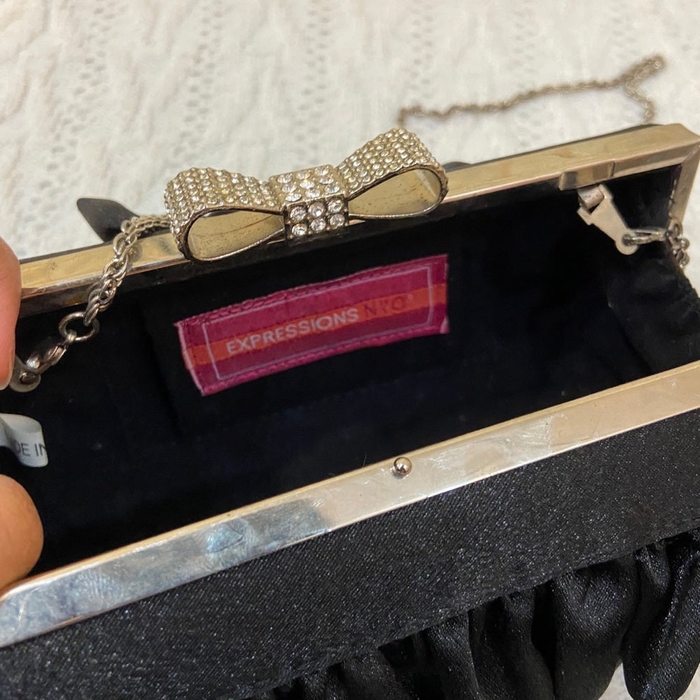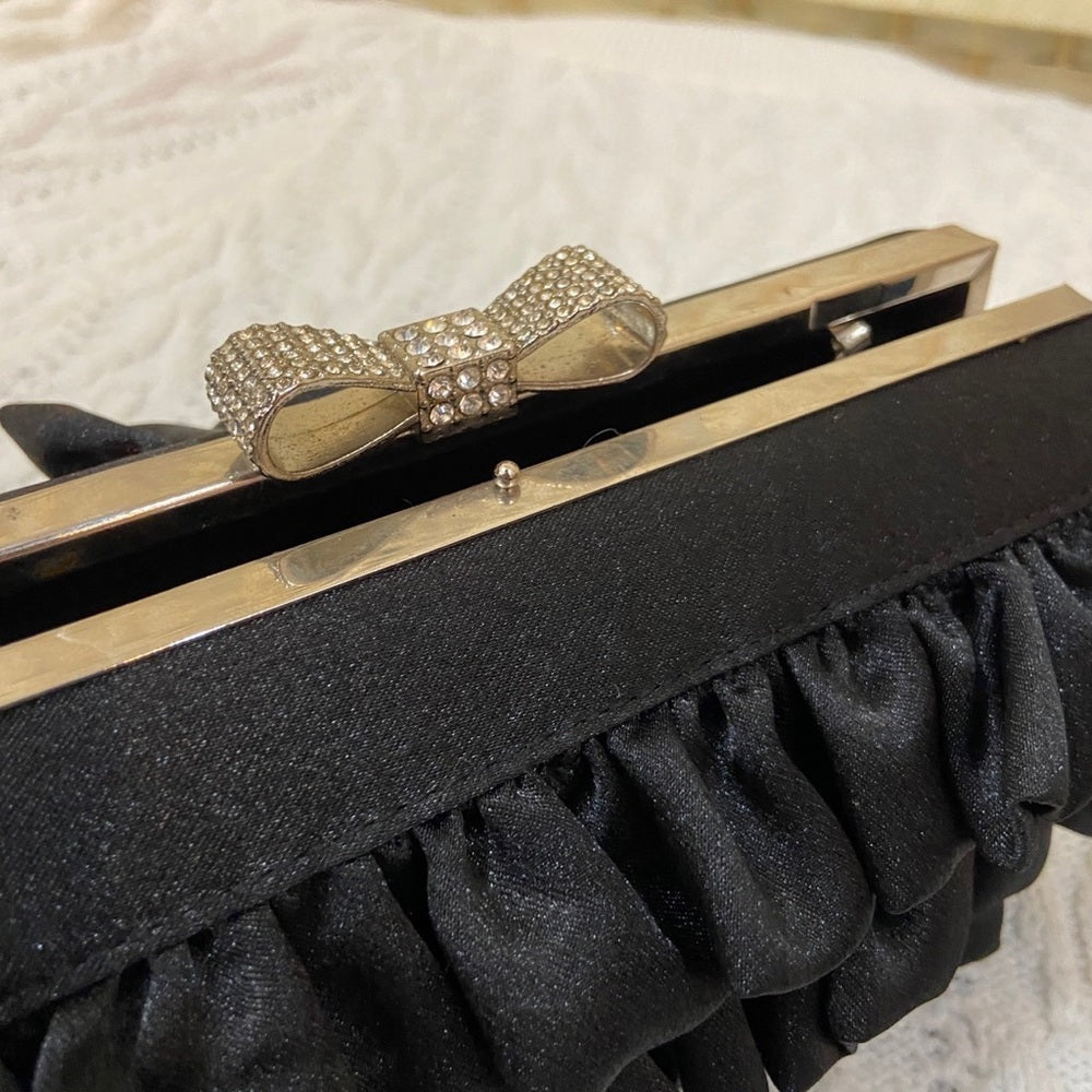 This is a beautiful pre-owned evening bag, boxy and decorated with a bow and rhinestones and layered ruffles around it. It measures 7 inches long, 3.5 inches high, and 2.5 inches wide. It comes with a chain strap of 24 inches long. It is in good condition with minimal wear as shown in photos. Pictures are worth a thousand words so Please super size photos for condition details.
