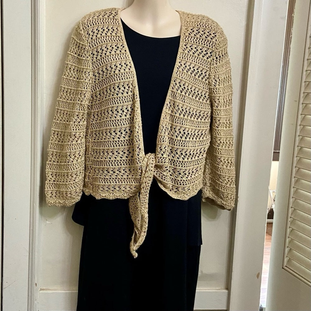 This is a beautiful, pre-owned beige and gold knitted cover-up, tie top or shawl. It is in very good condition as shown in photos. The actual measurements follows: