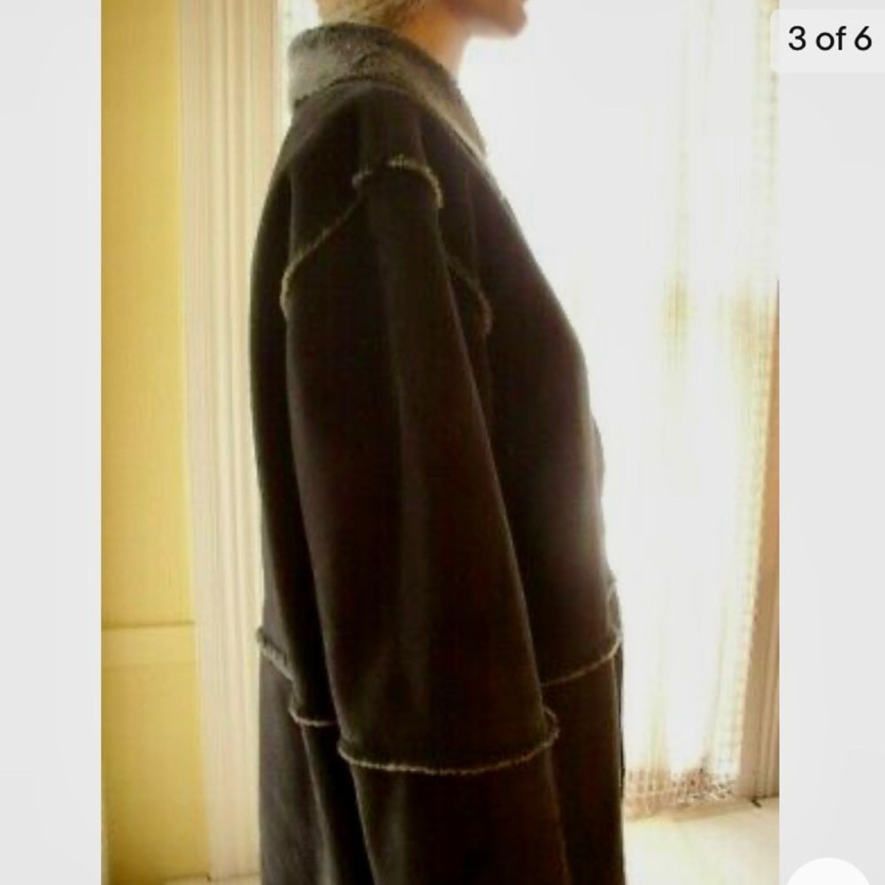This is a beautiful black sued leather sports coat with reverse leather gray fur collar and 2 hidden side pockets. It is in very good condition with minimal wear as shown in photos. This will fit Size: L, actual measurements follows: