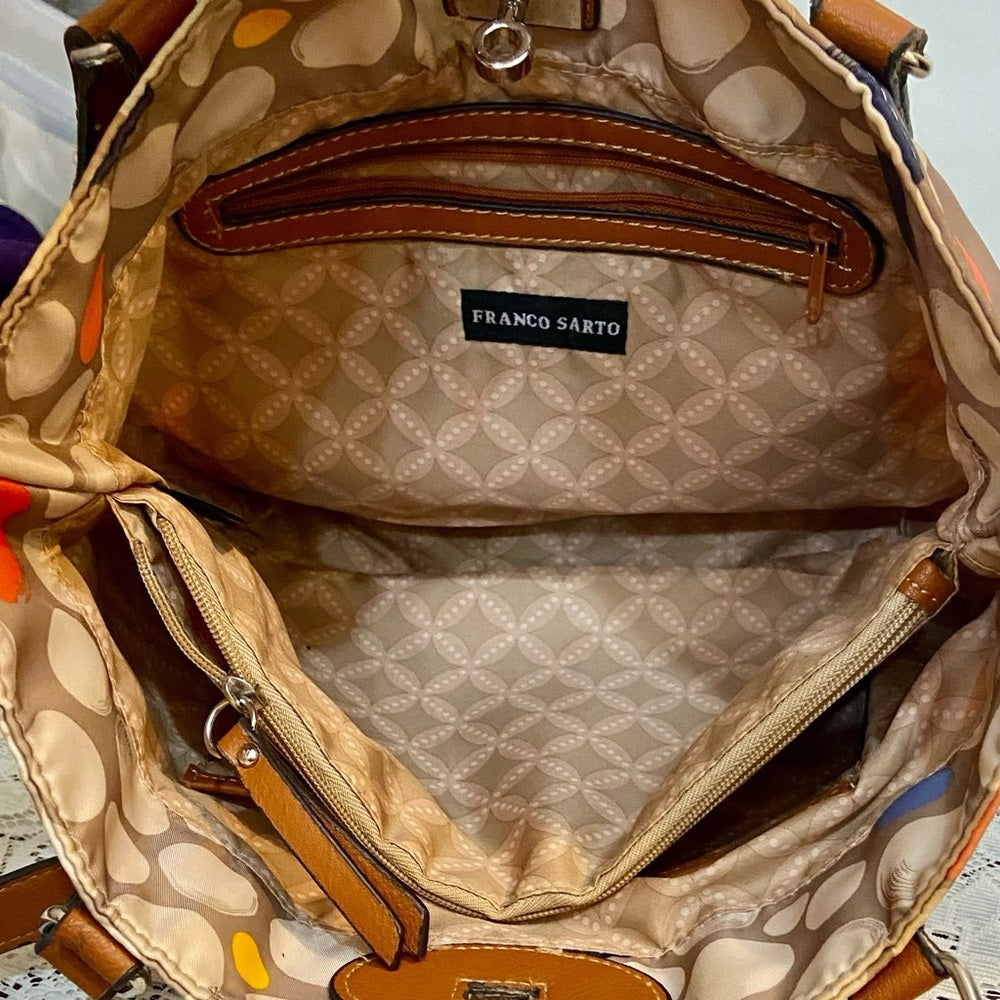 This is a beautiful handbag or shoulder bag made of polka dot canvas or fabric. It measures 11 inches long, 10 inches high and 4 inches wide. The strap is about 22 inches long. It is in good condition with minimal wear or soiling as shown in photos. It has a maker’s label as Franco Sarto. Pictures are worth a thousand words so please super size photos for condition details.