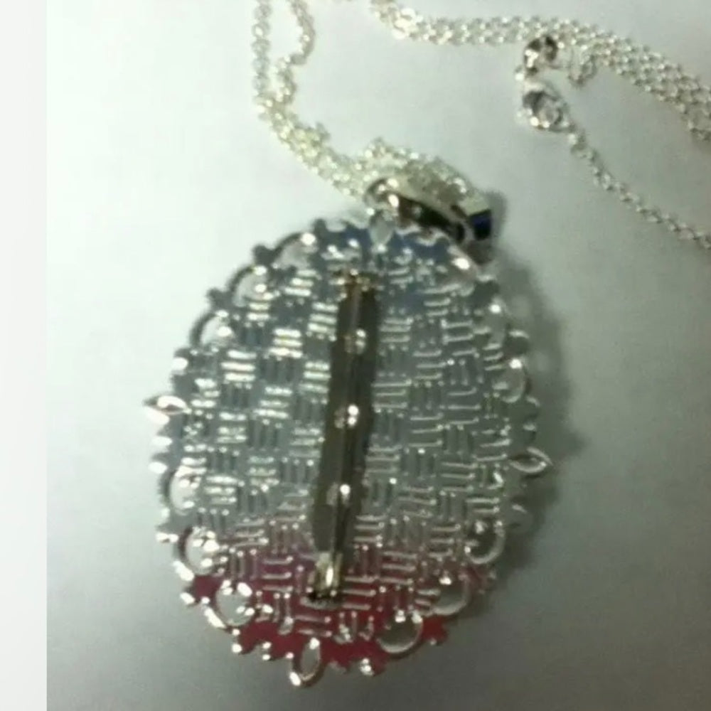 This is a beautiful brooch or pendant necklace depicting an elegant lady wearing a greenish-turquoise gown. The portrait is covered with glass cabochon and comes with an ornate silver tone frame. It has pin brooch at the back and comes with a 20-inch sterling chain necklace so it can be worn as a pendant as well . This lady pendant with frame, measures about 2.5 inches long and about 2 inches wide. It is in very good vintage condition as shown in photos. The chain is marked 925.