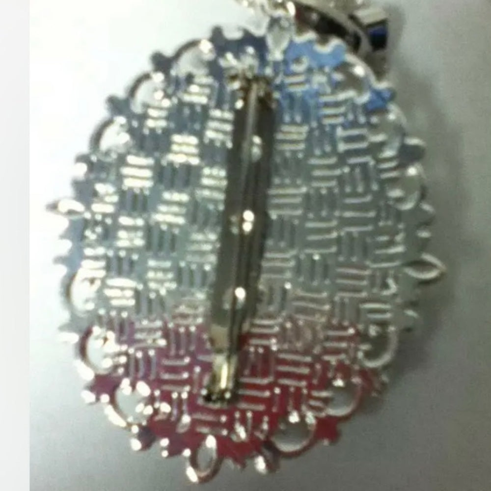 This is a beautiful brooch or pendant necklace depicting an elegant lady wearing a purple gown. The portrait is covered with glass cabochon and comes with an ornate silver tone frame. It has pin brooch at the back and comes with a 20-inch sterling chain necklace so it can be worn as a pendant as well . This lady pendant with frame, measures about 2.5 inches long and about 2 inches wide. It is in very good vintage condition as shown in photos. The chain is marked 925.