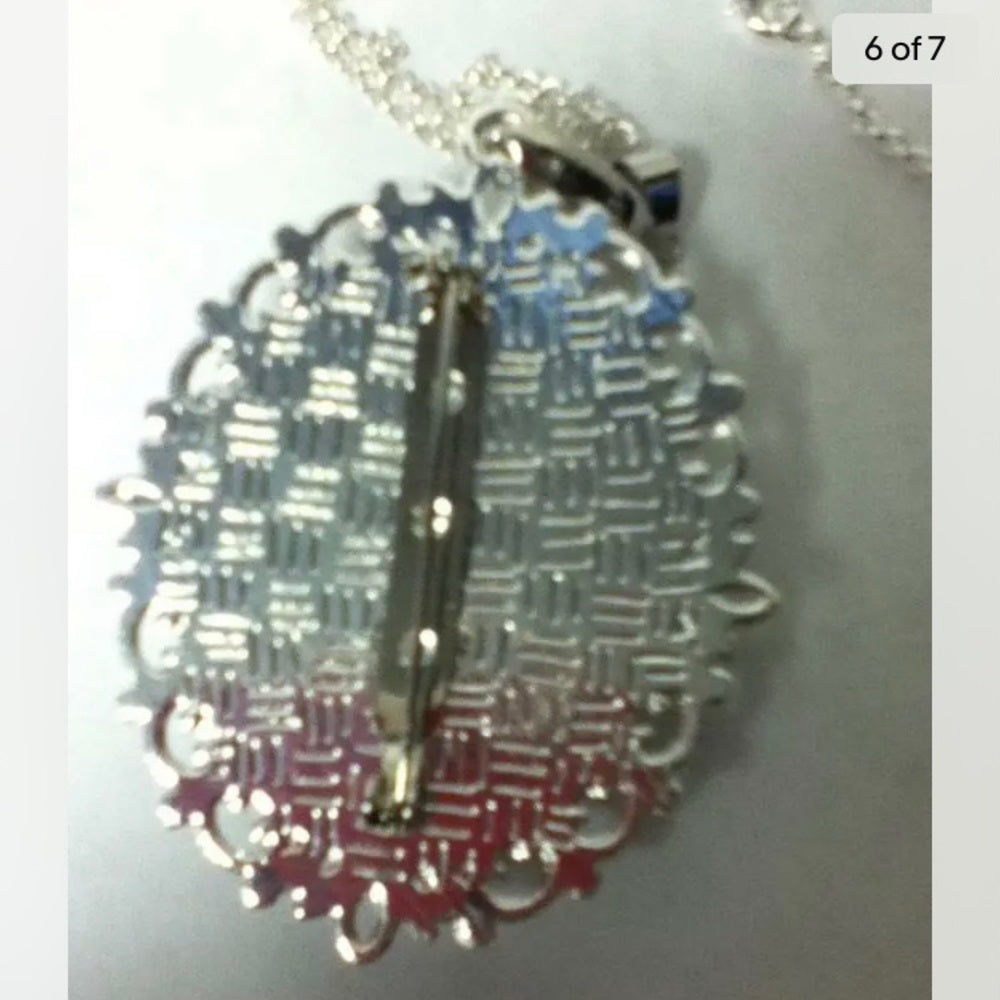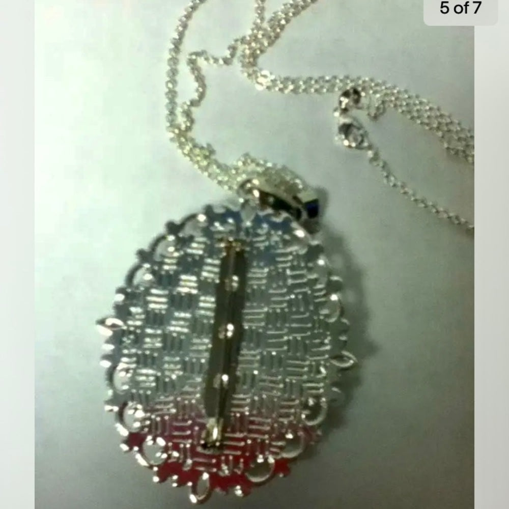 This is a beautiful brooch or pendant necklace depicting an elegant lady wearing a white gown. The portrait is covered with glass cabochon and comes with an ornate silver tone frame. It has pin brooch at the back and comes with a 20-inch sterling chain necklace so it can be worn as a pendant as well . This lady pendant with frame, measures about 2.5 inches long and about 2 inches wide. It is in very good vintage condition as shown in photos. The chain is marked 925.
