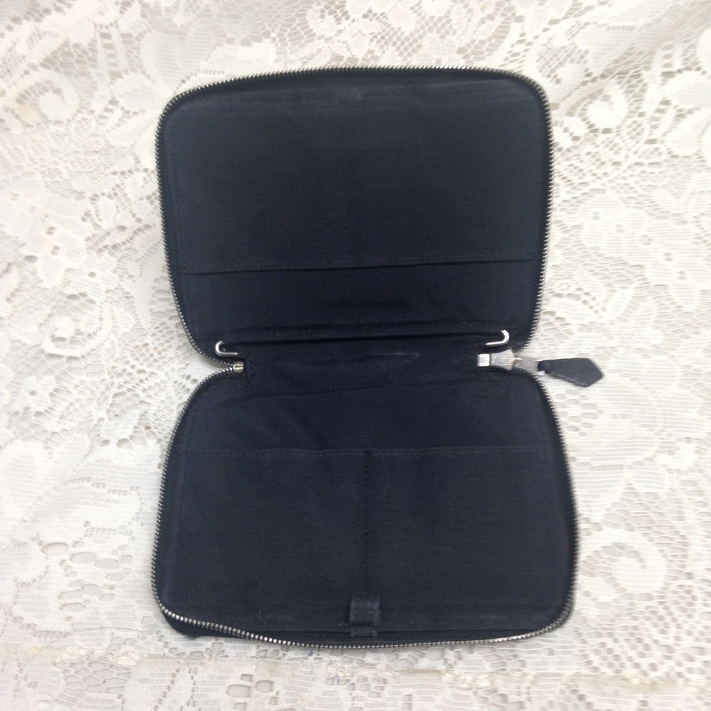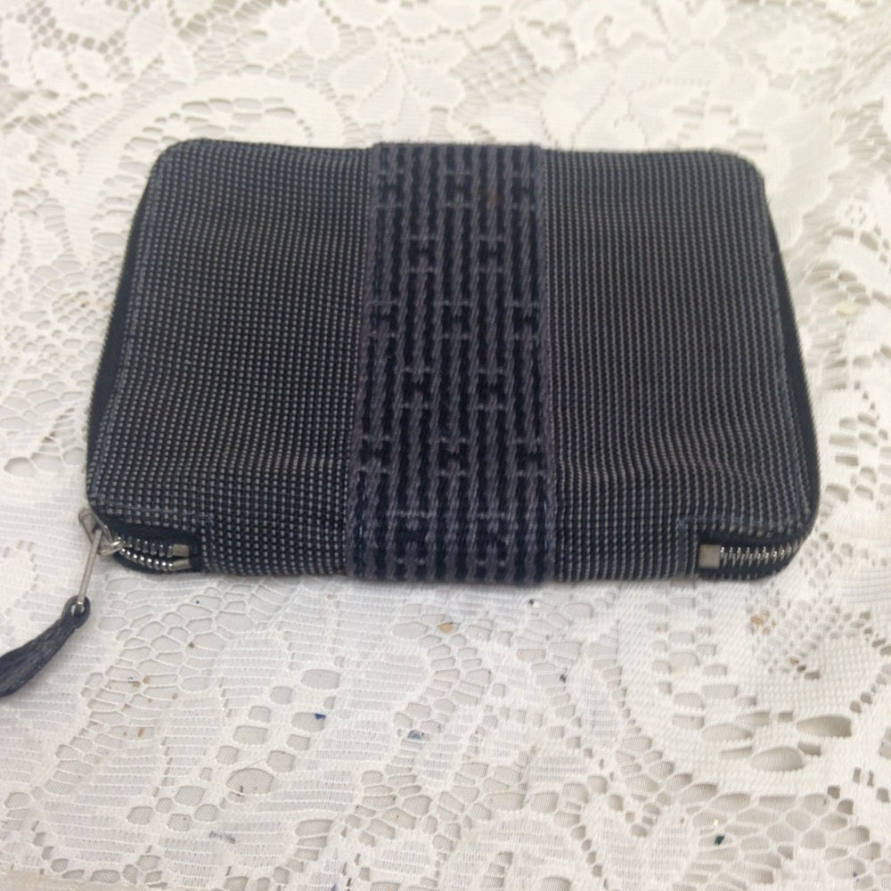 This is a pre-owned zip-around, Agenda Day Planner or notebook cover made of gray canvas exterior and black nylon nyerior. It measures 5.5 inches long and 4.5 inches wide. It is in good condition with original label that reads Hermes, Paris; Made in France.