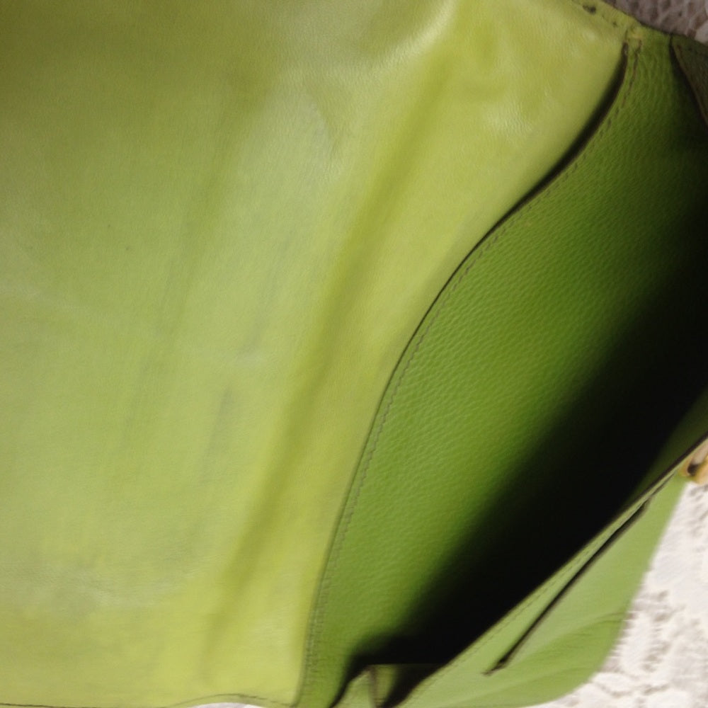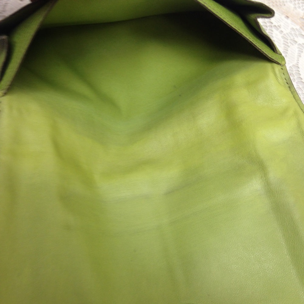 This is a beautiful large bifold wallet and coin purse made of green leather. This wallet can accomodate coins, keys, bills, ID or Credit card. The wallet measures 7.75inches long and 4.75 inches wide. The Coin Purse measures about 6.5 inches long and 3.75 inches wide. It has soiling, discoloration, fading and creases as shown in photos. It is marked: Hermes, Paris, Made in France. With Date Code as E 3N or 2001.