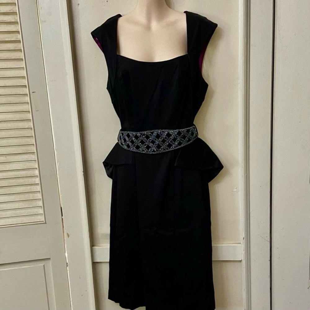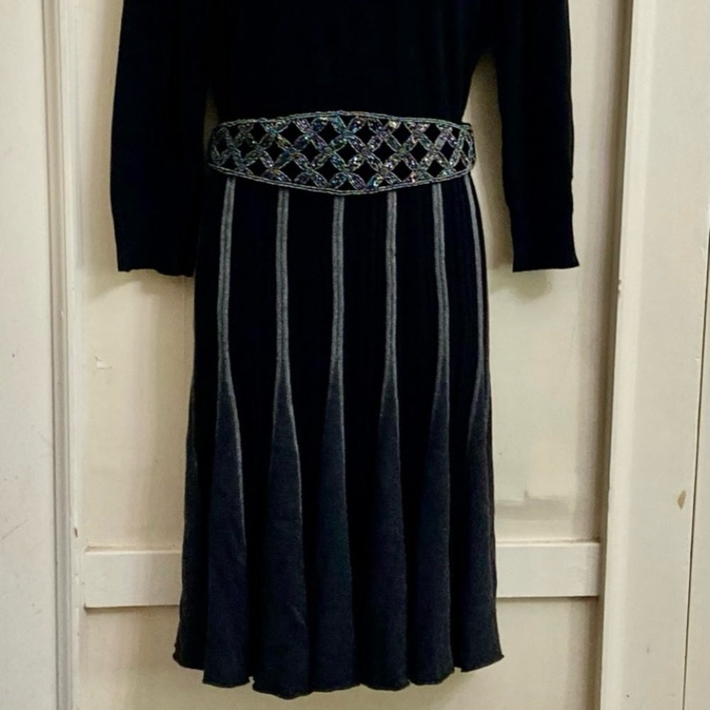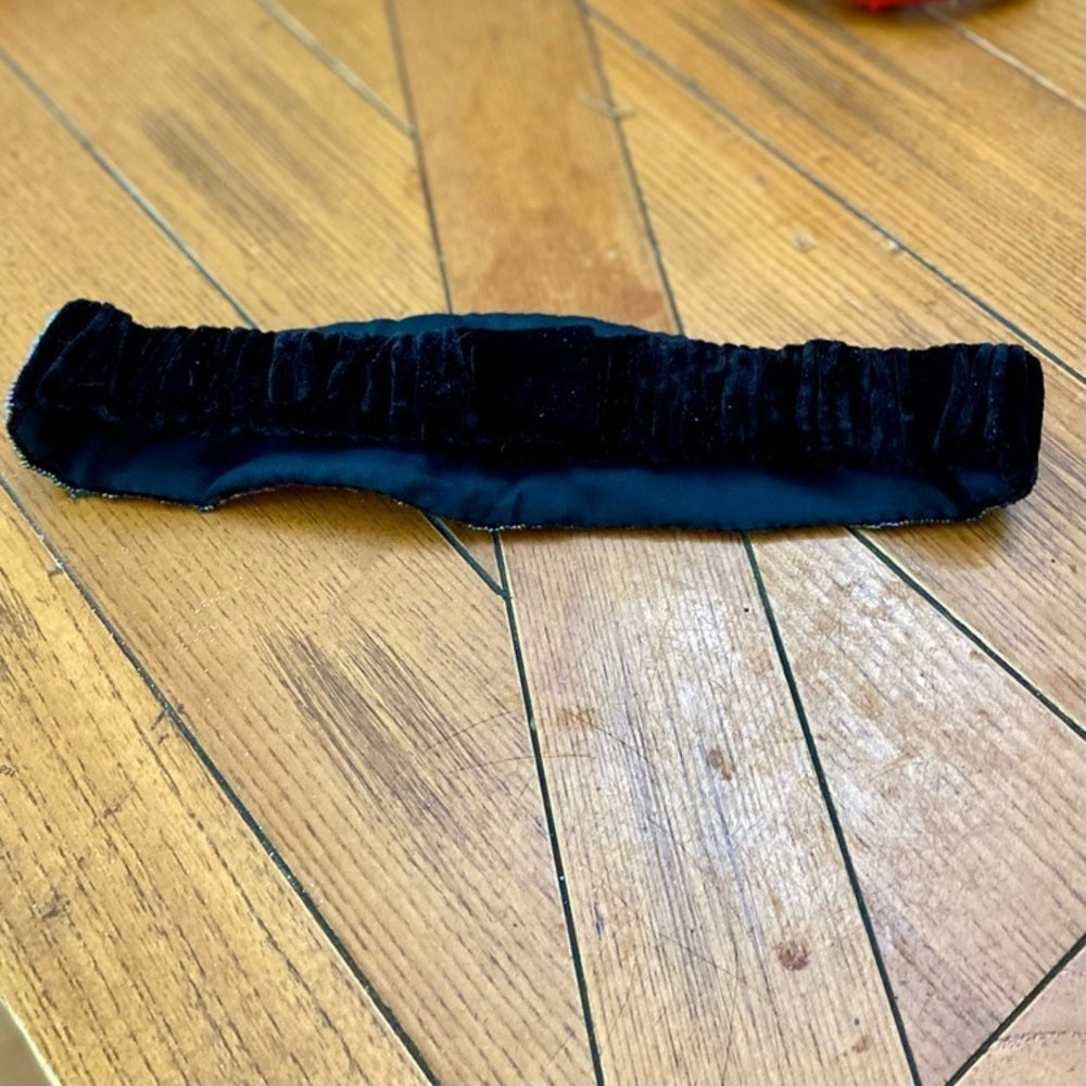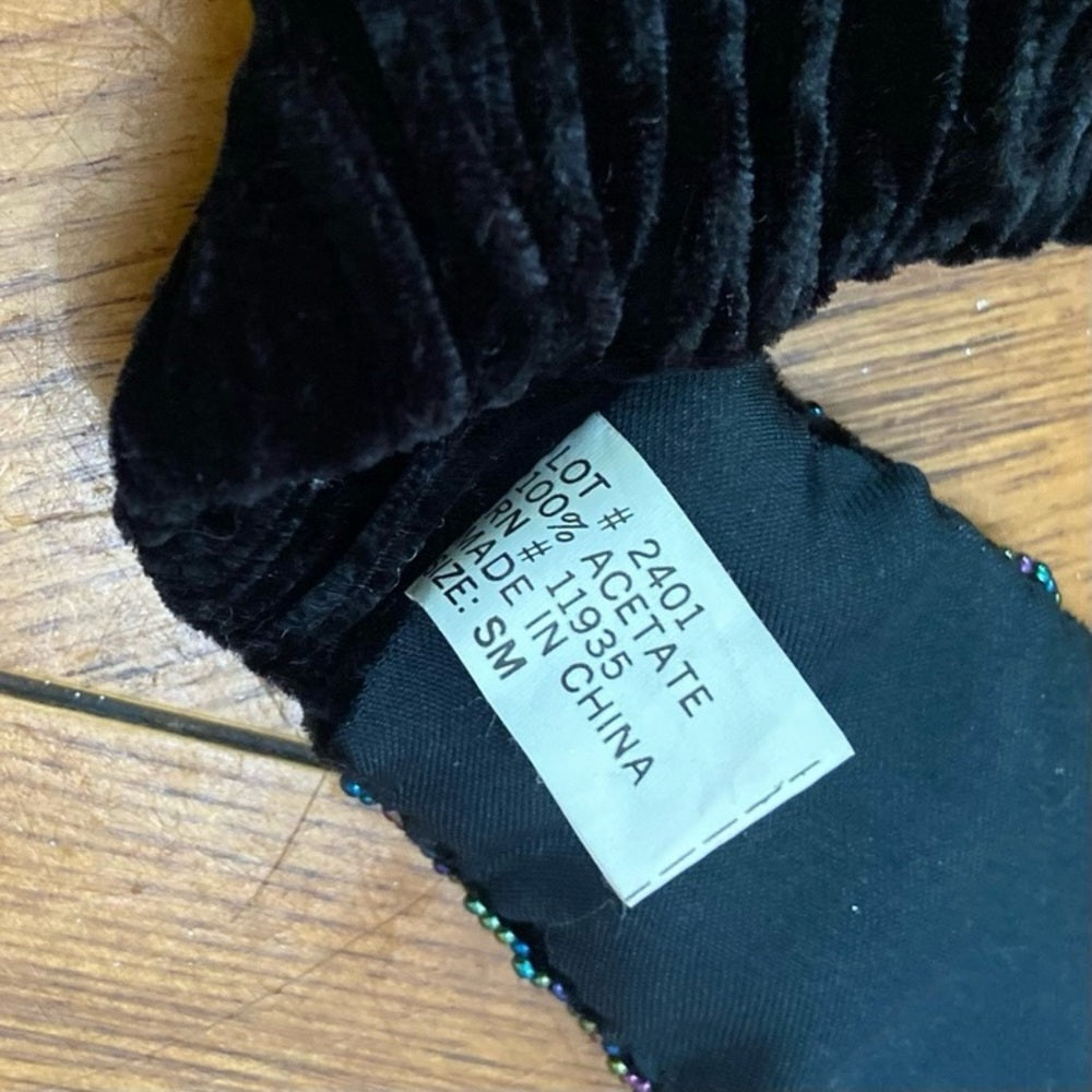 This is an elegant, stretchable belt made of multi color or iridescent beads over black velvet material. It measures 28 inches long and 3 inches wide. It is in very good vintage condition and this will fit waist or hips 26-32 inches.