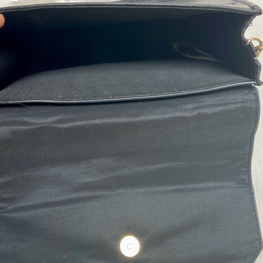 This is a pre-owned cosmetic pouch made of black faux patent leather with 44-inch shoulder or Crossbody gold chain. It measures 7.5 inches long, 5 inches wide and 2.5 inches wide. thick and it comes with an 20-inch shoulder strap. It is in very good condition, probably never been used as shown in photos.