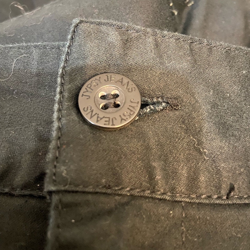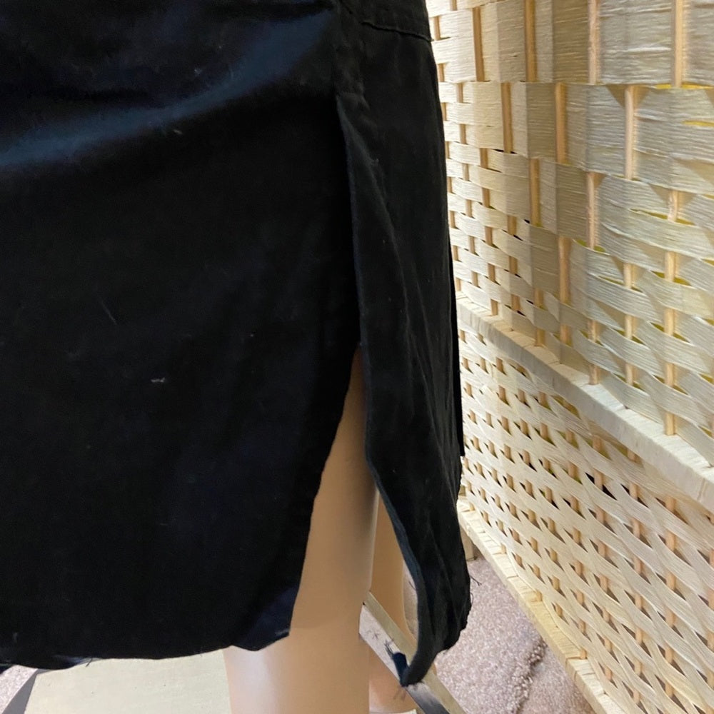 This is a beautiful black denim skirt with slit in the back. It has 2 side pockets and 2 front ones. It is in good condition with minimal wear as shown in the pictures above. This will fit size: medium to large, actual measurements to follow: