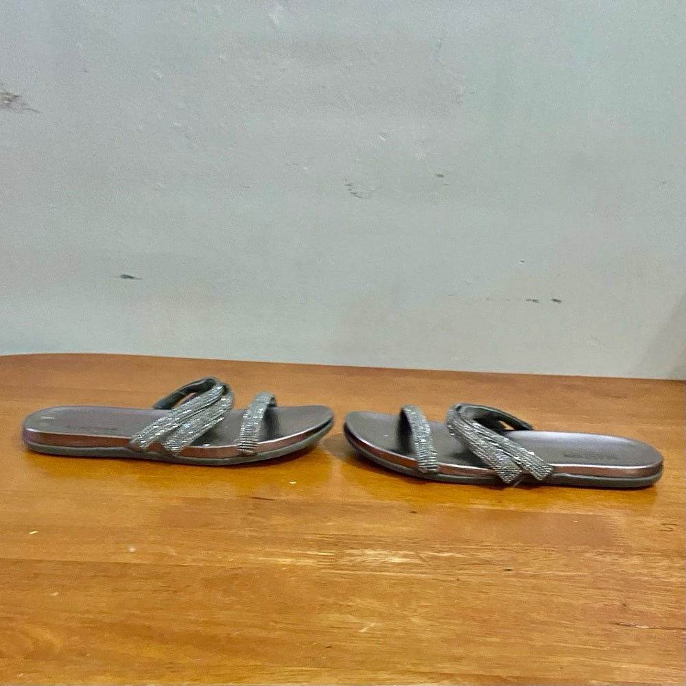 This is a beautiful pre owned pair of flat Sandals paved with glitter like rhinestones. It is size 7.5 M and it measures 10 inches long, 3.74 inches wide, and 1-inch heels. It is in good condition with minimal wear as shown in photos.