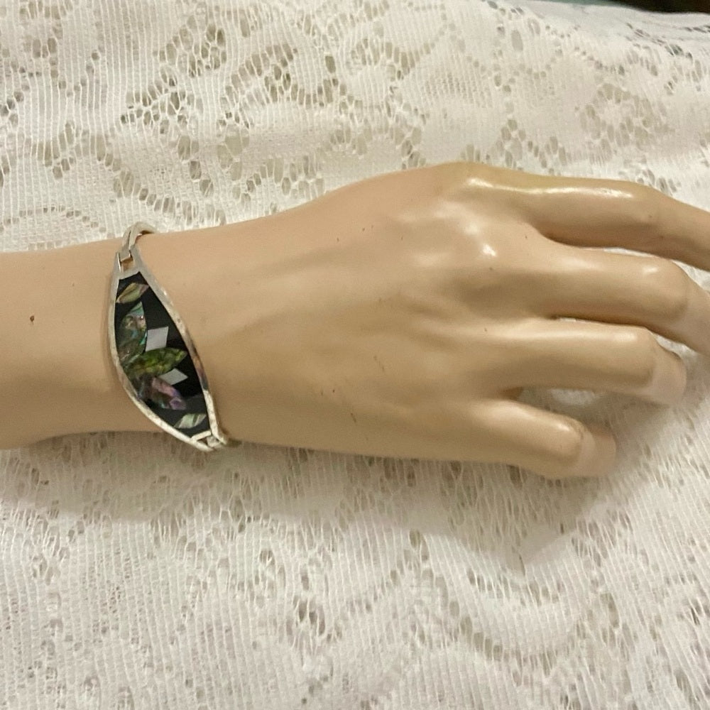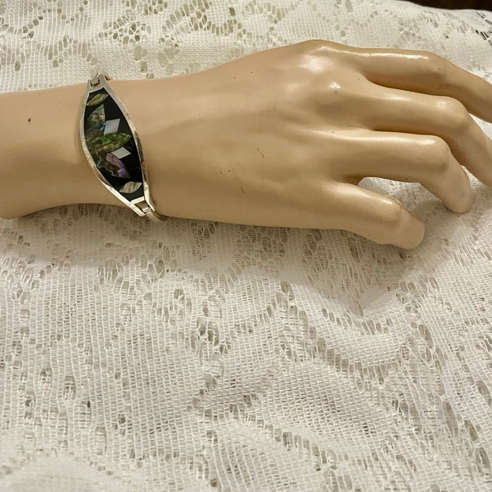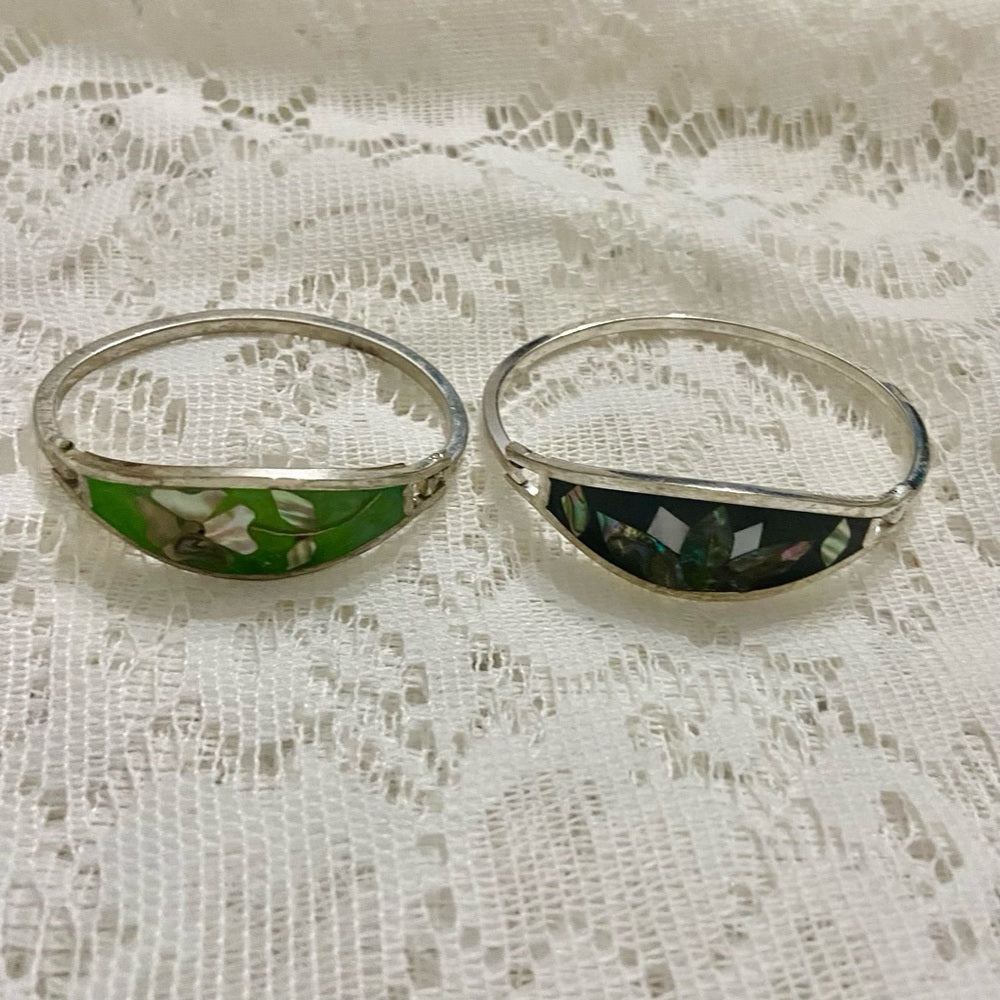 These are beautiful, vintage, silver bracelets with abalone inserts. It is in very good condition as show in the photos. The black silver medium size bracelet measures about 7 inches in circumference and 3/4 inches wide. The green one is smaller and measures 6.5 inches in circumference and about 3/4 inch wide. Please super size photos for condition details.