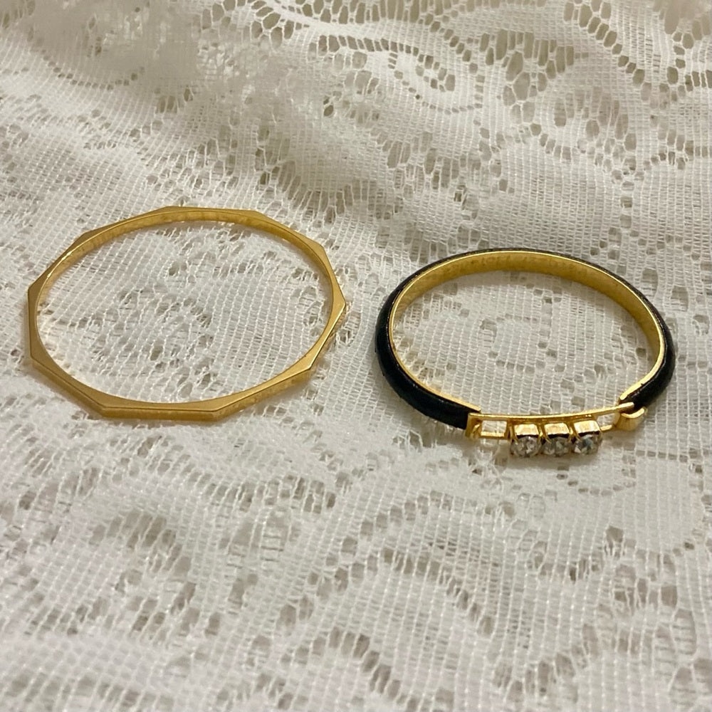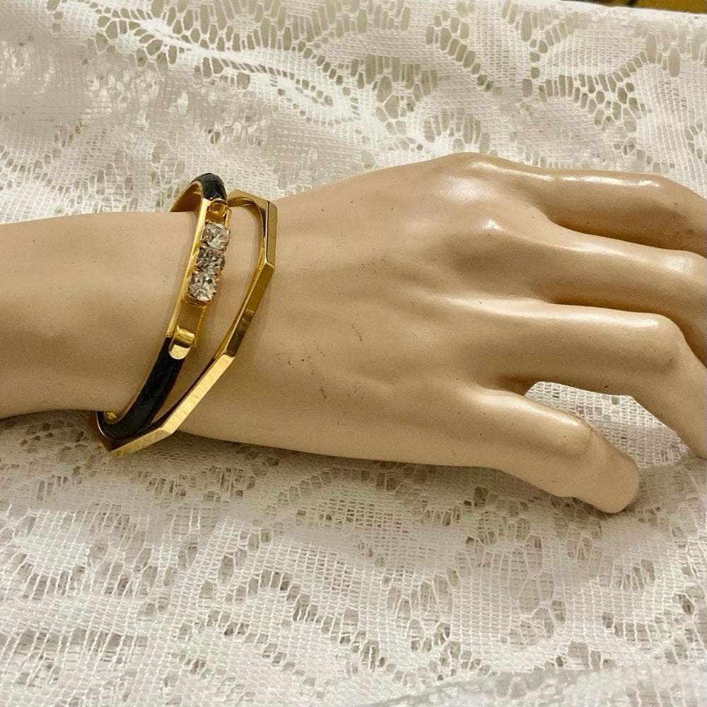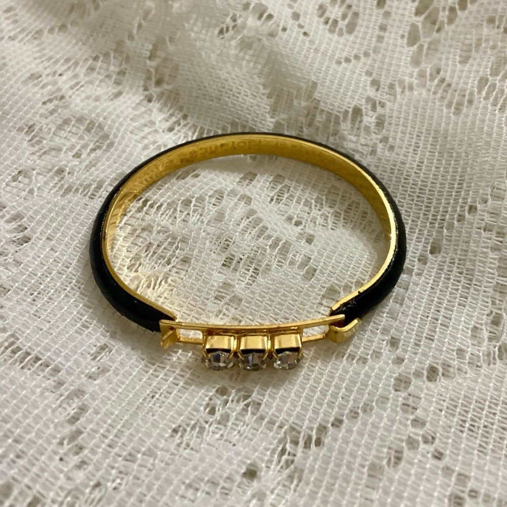Lot of 2 Vintage, Black Leather Bangle w/ Rhinestones and Gold Bracelet