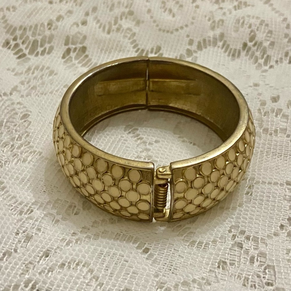 These are beautiful, vintage, chunky brass bangles: the black and gold one has no opening unlike the white and gold one. It is in very good condition as show in the photos. The gold and white hinged bangle measures 9.5 inches in circumference and 1.25 inches wide. The black and gold bangle measures 10 inches in circumference and about 1.5 inches wide. Please super size photos for condition details.