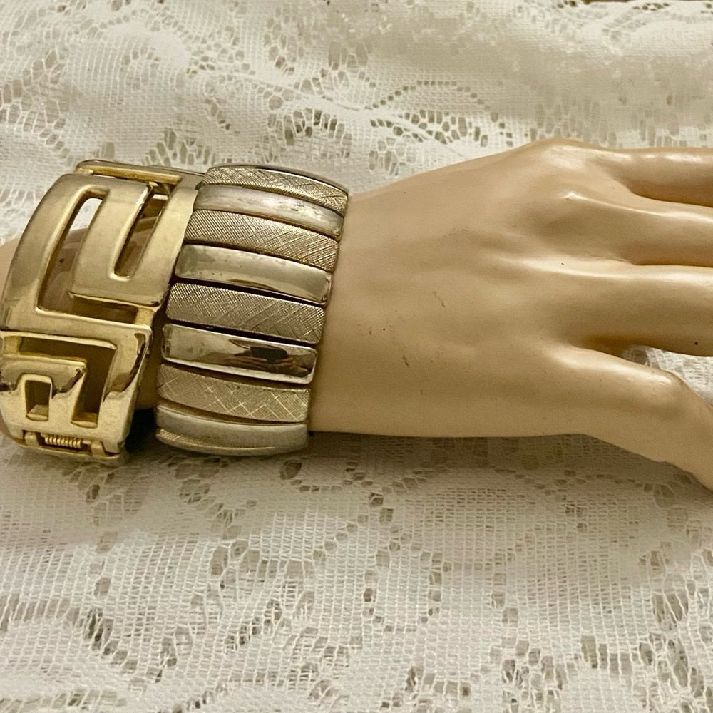 Lot of 2 Vintage Chunky, Gold Tone Greek Key Hinged and Stretchable Bracelet