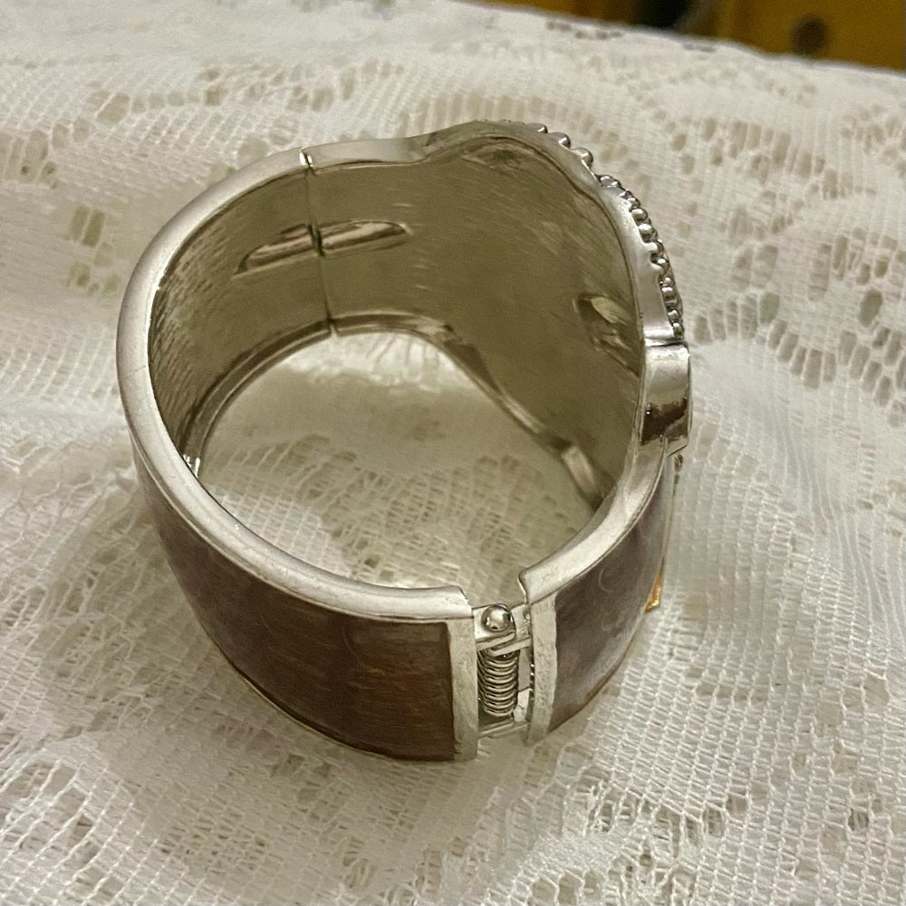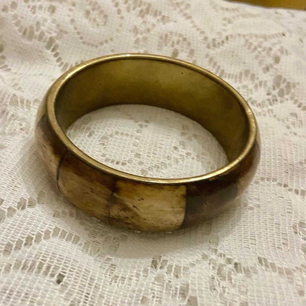 These are beautiful, vintage, chunky bangles: one hinged depicting a brown owl made of enamel or probably cloisonné over a silver tone metal and the other is made of brown or earth tone agate or probably made of antlers or bone over brass. It is in very good condition as show in the photos. The owl hinged bangle measures 8.5 inches in circumference and 2.25 inches wide. The brown Agate bangle measures about 10 inches in circumference and 1.25 inches wide. Please super size photos for condition details.