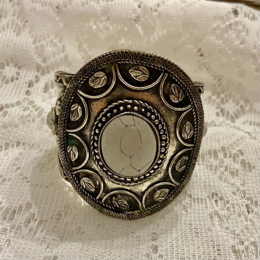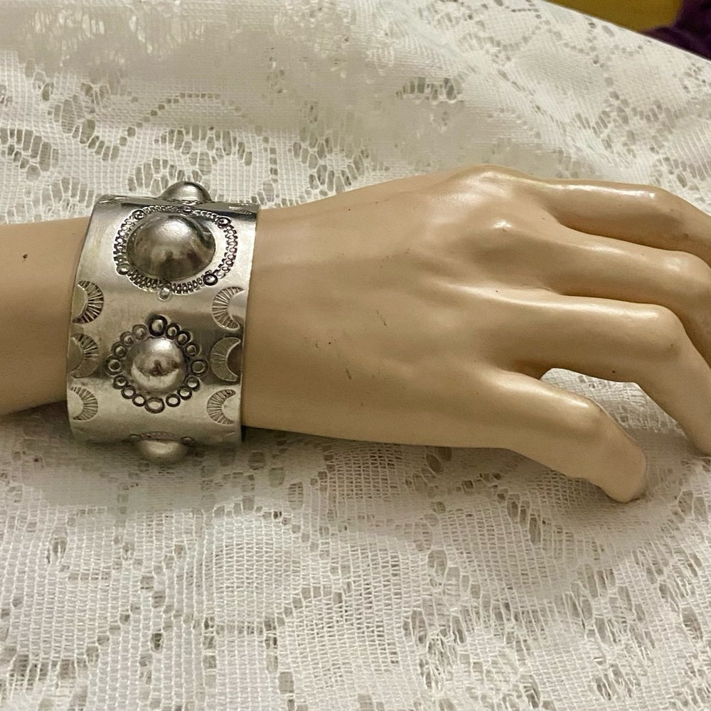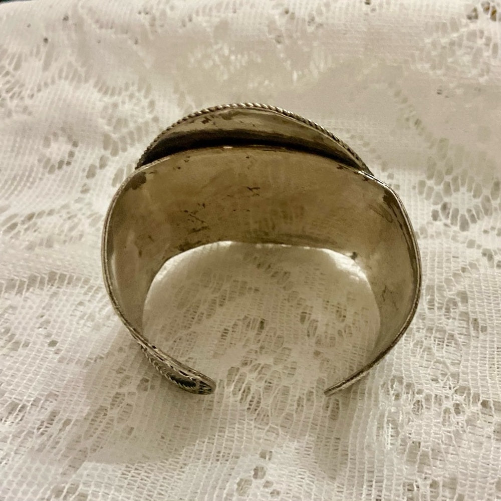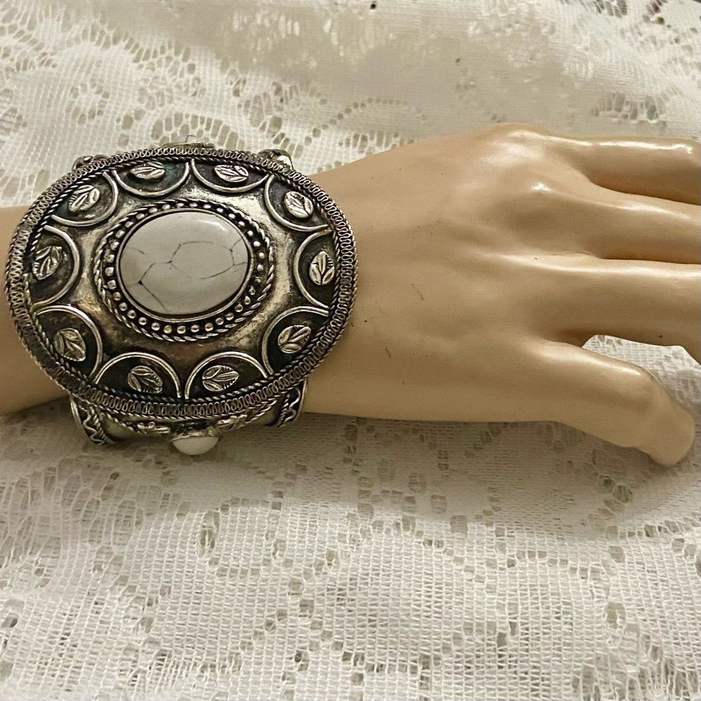 These are beautiful, vintage, chunky silver tone cuff bangles: one cuff made is decorated with a white agate and the other cuff bangle is hammered with moon like designs. It is in very good condition as shown in the photos. The one with a white agate centerpiece measures 8 inches in circumference and 3 inches wide. The hammered bangle measures 7.5 inches in circumference and 1.5 inches wide. Please super size photos for condition details.