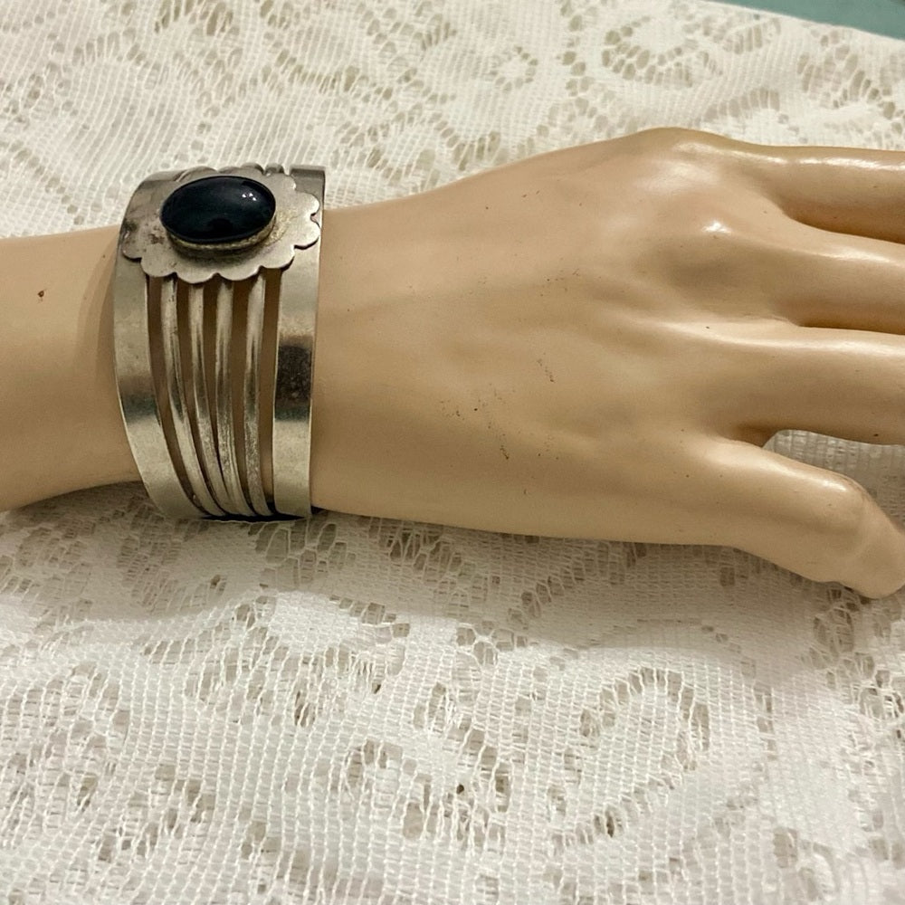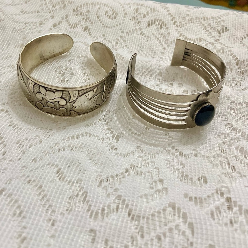 These are beautiful, vintage, chunky silver tone bangles: one cuff and is decorated with a black stone and the other bangle is engraved with fish and crab design. It is in very good condition as shown in the photos. The one with black stone centerpiece measures 8 inches in circumference and 1.5 inches wide. The engraved bangle measures 7.75 inches in circumference and 1 inches wide. Please super size photos for condition details.