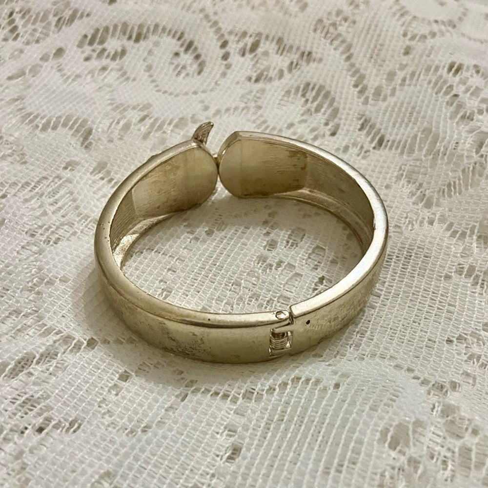 These are beautiful, vintage, chunky silver tone bangles: one cuff bangle with starfish design and the smaller hinged one is decorated with a small starfish with rhinestone. Both are in very good condition as show in the photos. The silver tone starfish cuff bangle measures about 8 inches in circumference and 2.5 inches wide. The small hinged bangle measures about 8 inches in circumference and about an inch wide. Please super size photos for condition details.
