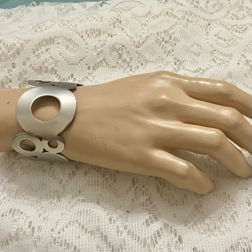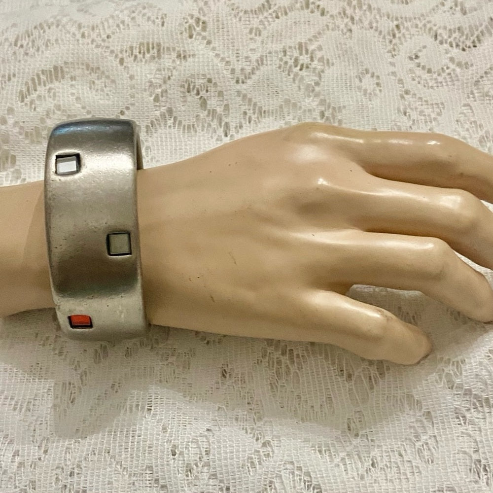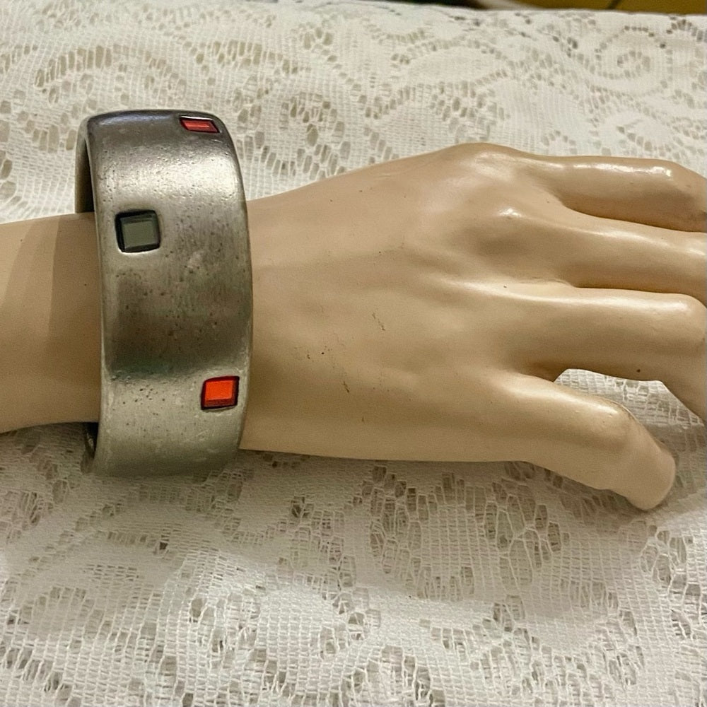These are beautiful, vintage, chunky silver tone bangles: one bangle with glass like rhinestones insert and the other is cuff with circular design. Both are in very good condition as show in the photos. The silver tone bangle measures 9.5 inches in circumference and 1.25 inches wide. The cuff circular bangle measures 7 inches in circumference and 1.5 inches wide. Please super size photos for condition details.