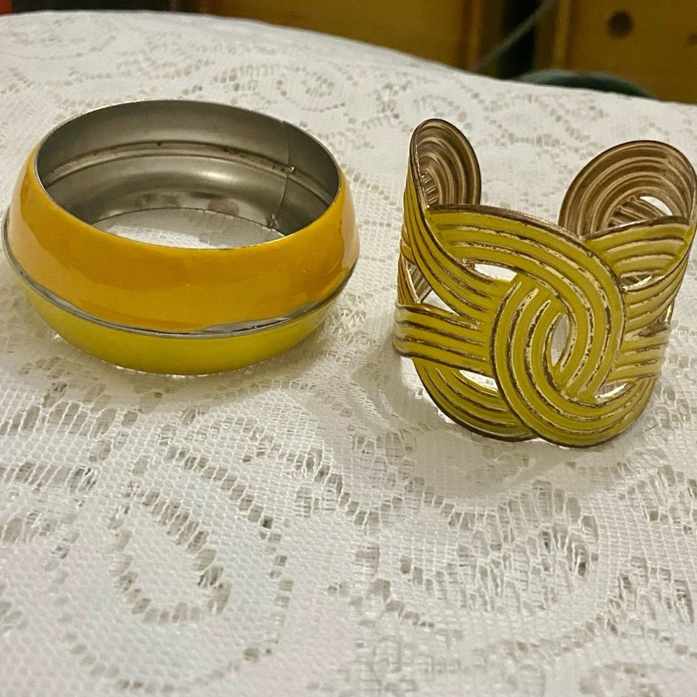 These are beautiful, vintage, chunky yellow and gold interlocking cuff bangle and one Yellow- Orange Bangle. It is in very good condition as show in the photos. The yellow and gold brass cuff bangle measures 8 inches in circumference and 2.25 inches wide. The yellow and orange enamel bangle over a silver tone metal measures 10 inches in circumference and 2.5 inches wide. Please super size photos for condition details.