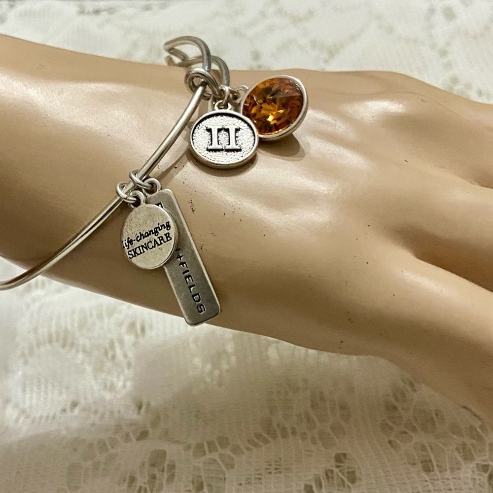These are beautiful, vintage, bangle bracelets-one has 4 charms by Rodan Fields the other is a silver cuff bangle with pink agate. It is in very good condition as show in the photos. The adjustable charm bracelet measures 8-10 inches in circumference and the cuff bangle measures 8 inches in circumference and the pink stone is about 1.25 inches wide. Please super size photos for condition details.