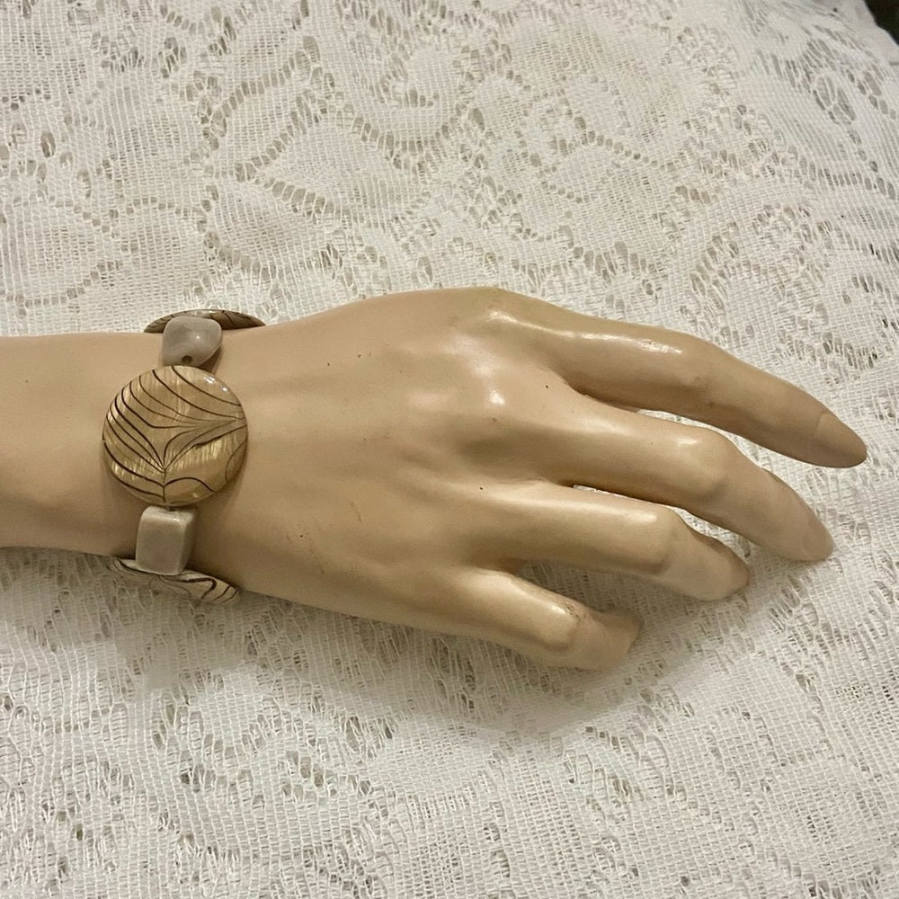 These are beautiful, vintage, glass beaded bracelets: the red crystal one with heart; the beige glass one is stretchable and the last one is green and brown beaded cuff bracelet. All 3 are in very good condition as show in the photos. The red one measures about 10 inches long; the other 2 is about to 8.5 inches in circumference. Please super size photos for condition details.