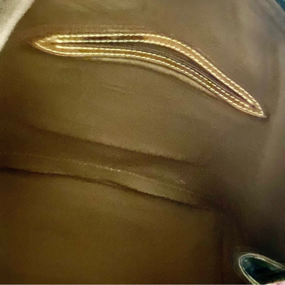 This is a beautiful brown mono, coated canvas handbag and it measures about 12 inches long, 10 inches high an 6.5 inches wide and comes with a 10-inch long drop handle. The leather trim and handle have been repainted to a brighter aquamarine color, scuffs or roughness on bottom corners as shown in photos. The inner lining is clean except for a small spots on the top leather of the coin pocket. Zipper has minimal issues but works just fine. It is marked : Louis Vuitton, Paris France. Date code is VI1928 Made in France, December 1998.