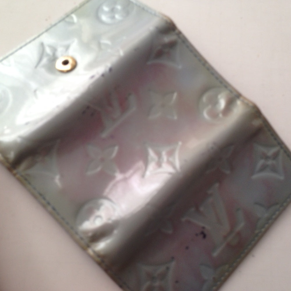This is a beautiful 4 hooks key case made of vernis mono in purplish blue color. This key cas has a slot for folded bills, ID or Credit card. Folded it measures about 4.25 inches long and 2.5 inches wide. It has edge wear, soiling, staining and discoloration as shown in photos. Date code: CA0023-Made in Spain February 2003.