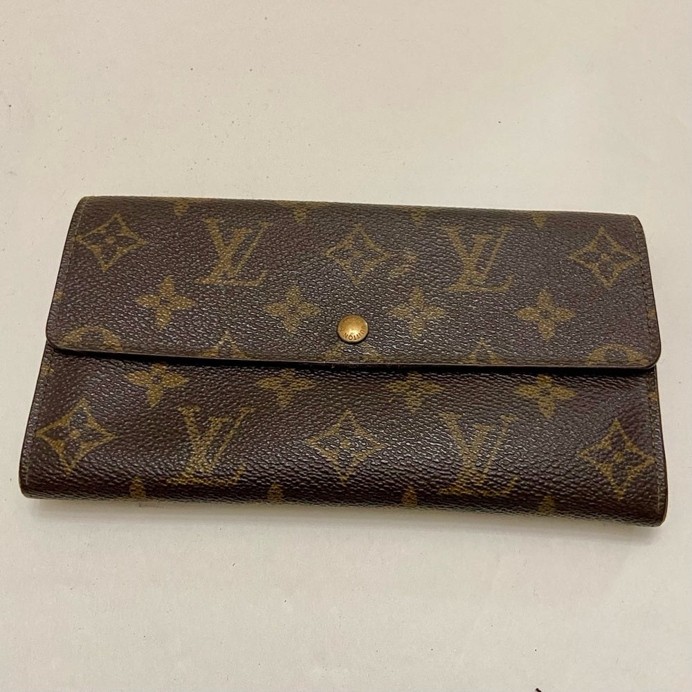 This is a pre-owned bi-fold, long wallet made of brown mono coated canvas. This wallet has a slots for bills, IDs and Credit cards. Also, it has a zip pocket for coins or keys. Folded it measures about 7.5 inches long and 4inches wide. It has a replaced zipper pull, minimal soiling and discoloration as shown in photos. Date code: MI0992, Made in France, September 1992.