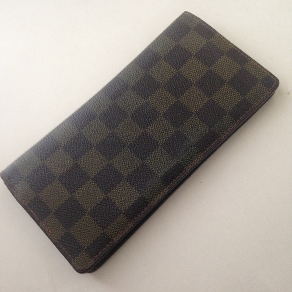 This is a pre-owned bi-fold, long wallet made of brown Damier coated canvas. This wallet has a slots for checkbook, bills, IDs and Credit cards and pocket for coins and keys. Folded it measures about 7.5 inches long and 4 inches wide. It has fading, discoloration, edge wear, chips and splits on the folded corners. Also, the zipper on coin pocket was removed or missing. Date Code: SP2087-Made in France, 28th week of 2007.