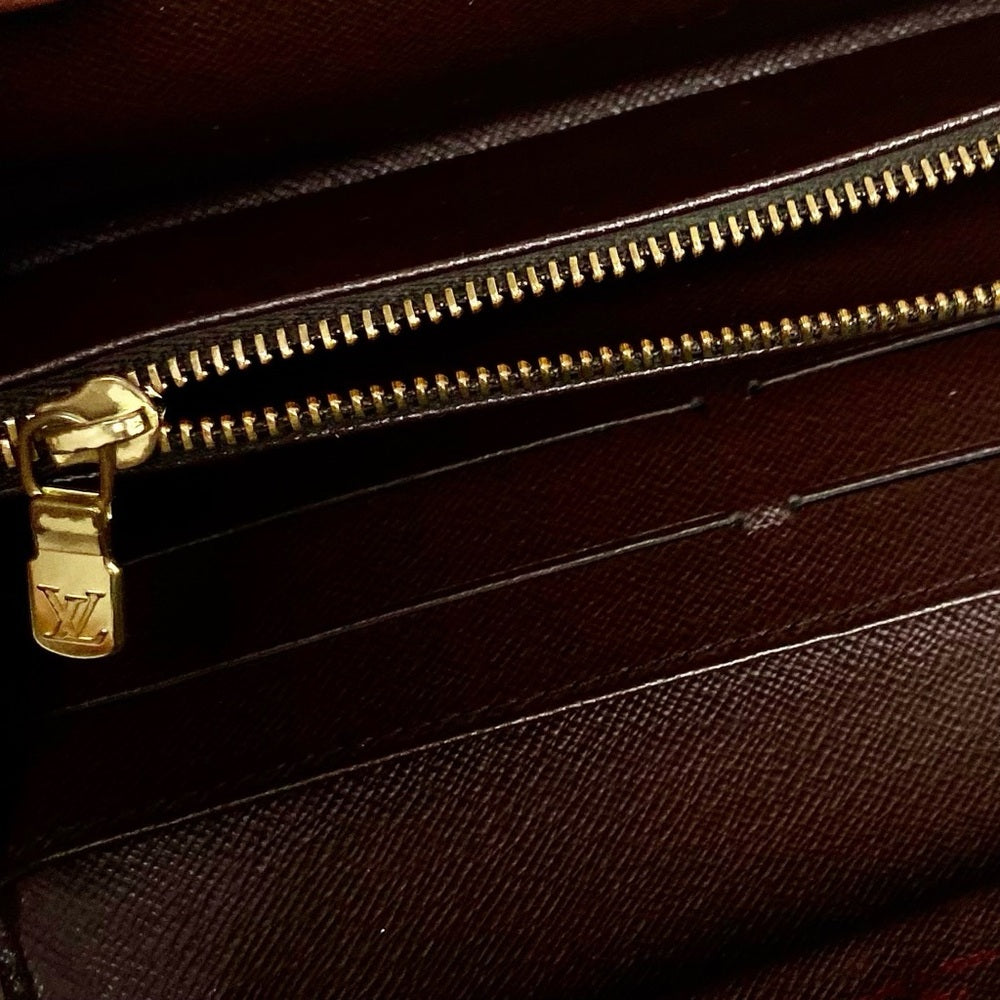 This is a pre-owned bi-fold long wallet made of Damier Ebene coated canvas. This wallet has a slots for bills, IDs and Credit cards. Also, it has a pocket for coins or keys. Folded it measures about 7.5 inches long and 4.5 inches wide. It is in good condition with minimal wear, soiling, discoloration or fading and edge wear as shown in photos. Crossbody chain is about 50 inches long and it is not original or was added to make it as a crossbody. Date Code: - Made in France-.