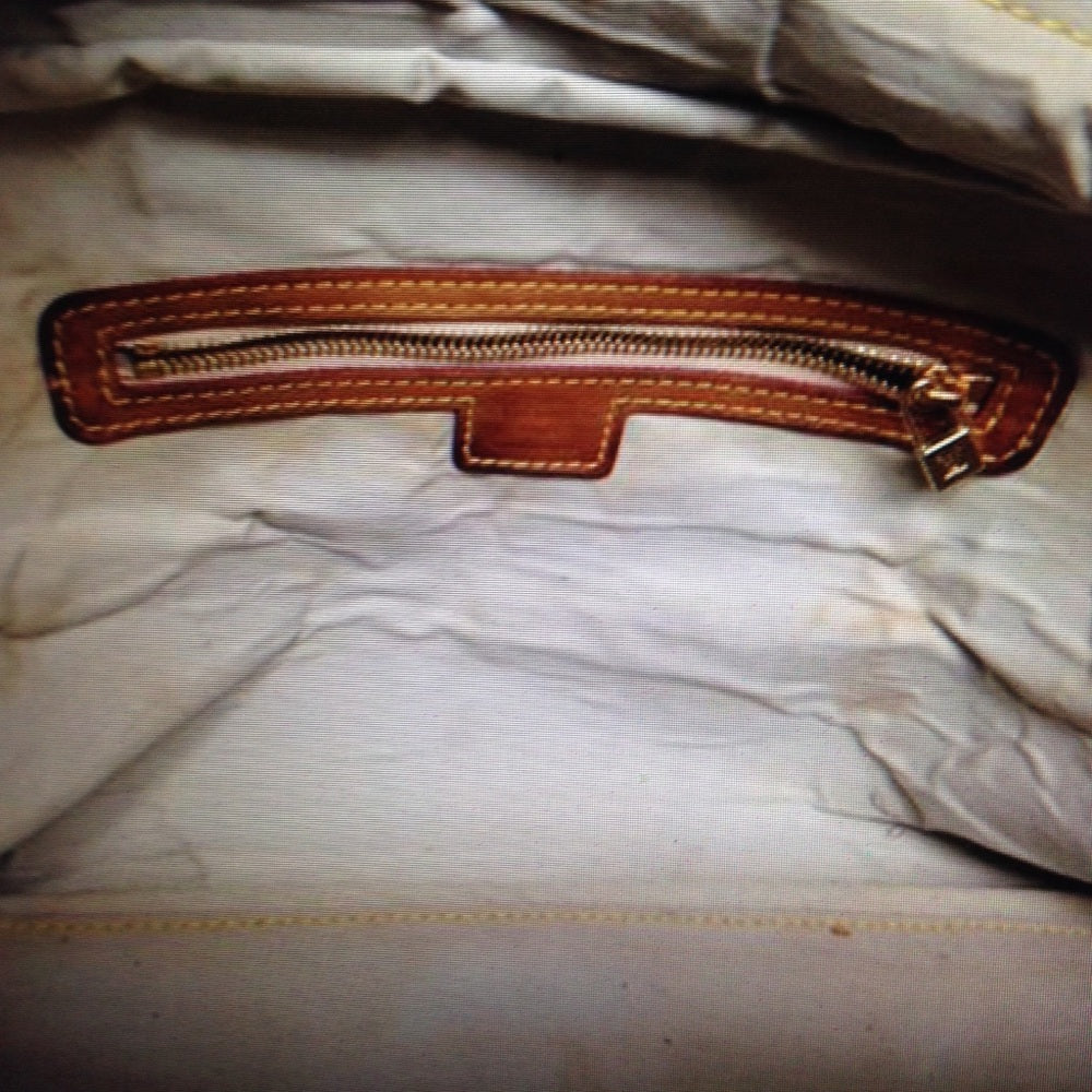 This is a pre-owned white denim with blue monogram Mini Lin Canvas Handbag. It measures about 14 inches long, 10 inches high and 4.5 inches wide. Leather handle have been replaced, some soiling and discoloration, interior lining is crumpled and needs cleaning or dry cleaning as shown in photos. Please super size photos for details. Date Code is CA0050- Made in Spain, May2005.
