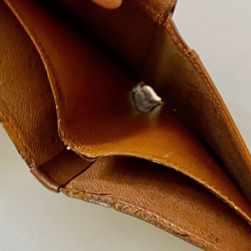This is a pre-owned credit card mens wallet made of brown monogrammed coated canvas. Folded it measures about 4 inches long and 4 inches wide. It is in distressed condition or has discoloration, soiling, tear, bad edge wear on folded area and corners that was covered with brown leather trim as shown in photos. Please supersize photos for condition details. Date code CA0914 - Made in Spain, January 1994.